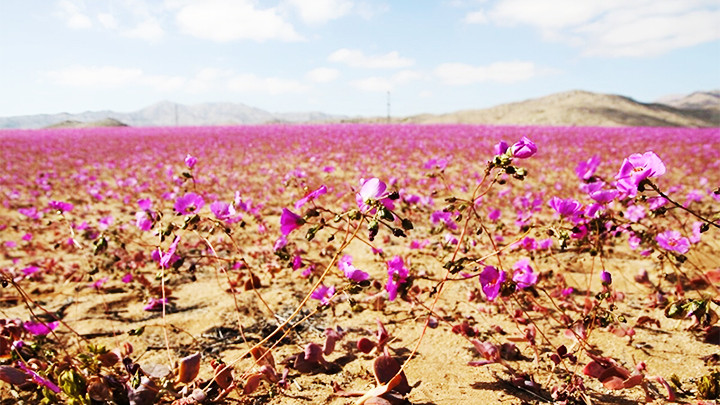 Theo CNN, sa mạc Atacama thuộc miền bắc Chile, nổi tiếng là một trong những khu vực khô cằn nhất trên Trái đất, đang nở rộ thảm hoa mầu trắng và tím rực rỡ (trong ảnh). Cứ vài năm một lần, sa mạc Atacama lại được phủ đầy hoa khi lượng mưa và nhiệt độ thích hợp đánh thức những hạt giống đang ngủ yên.