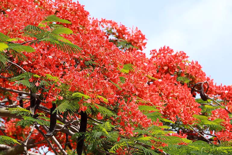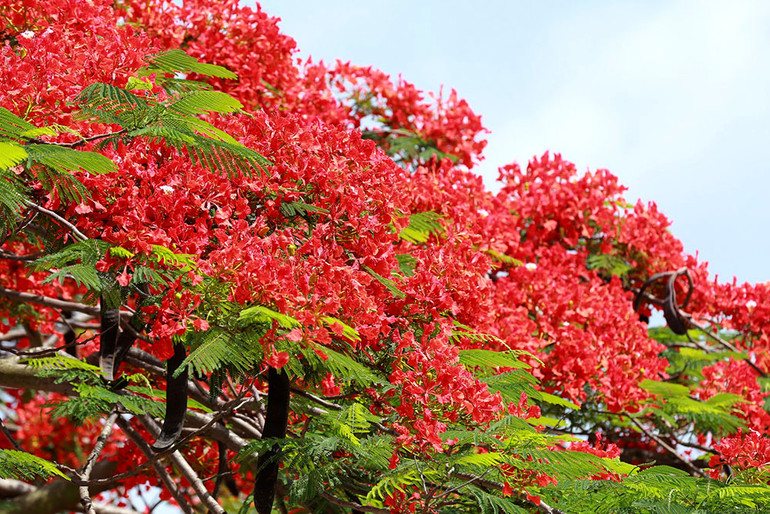Những cánh phượng mỏng manh, đỏ tươi khoe sắc giữa nền trời xanh biếc tạo ra nét đặc trưng của mùa hạ.