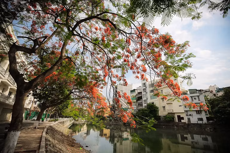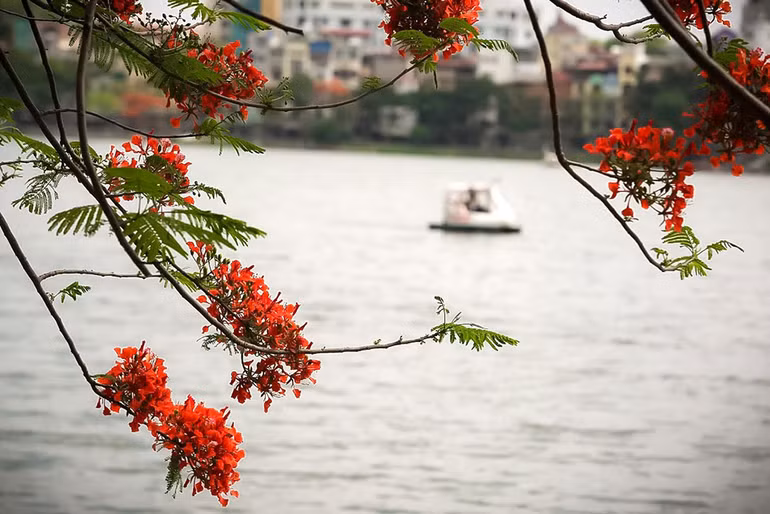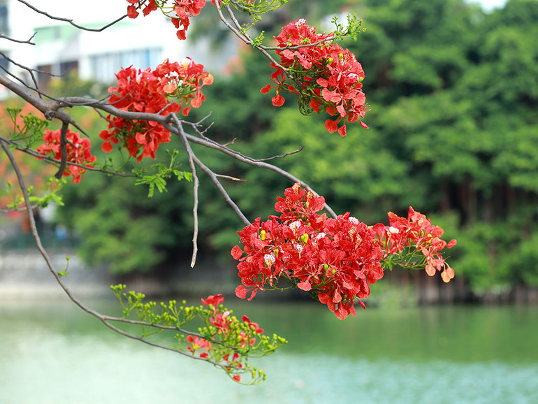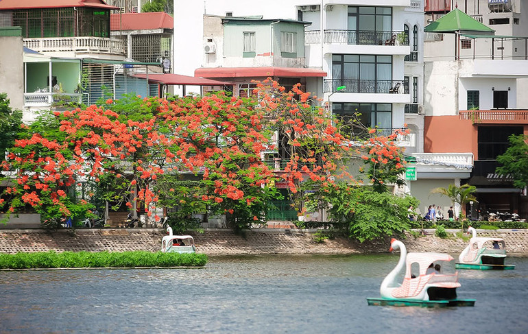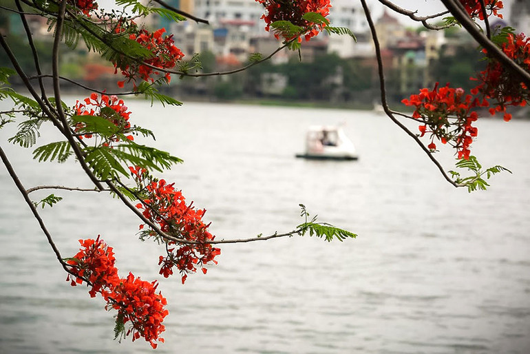 Những cành phượng nặng trĩu bông soi bóng trên mặt hồ Trúc Bạch (Tây Hồ).