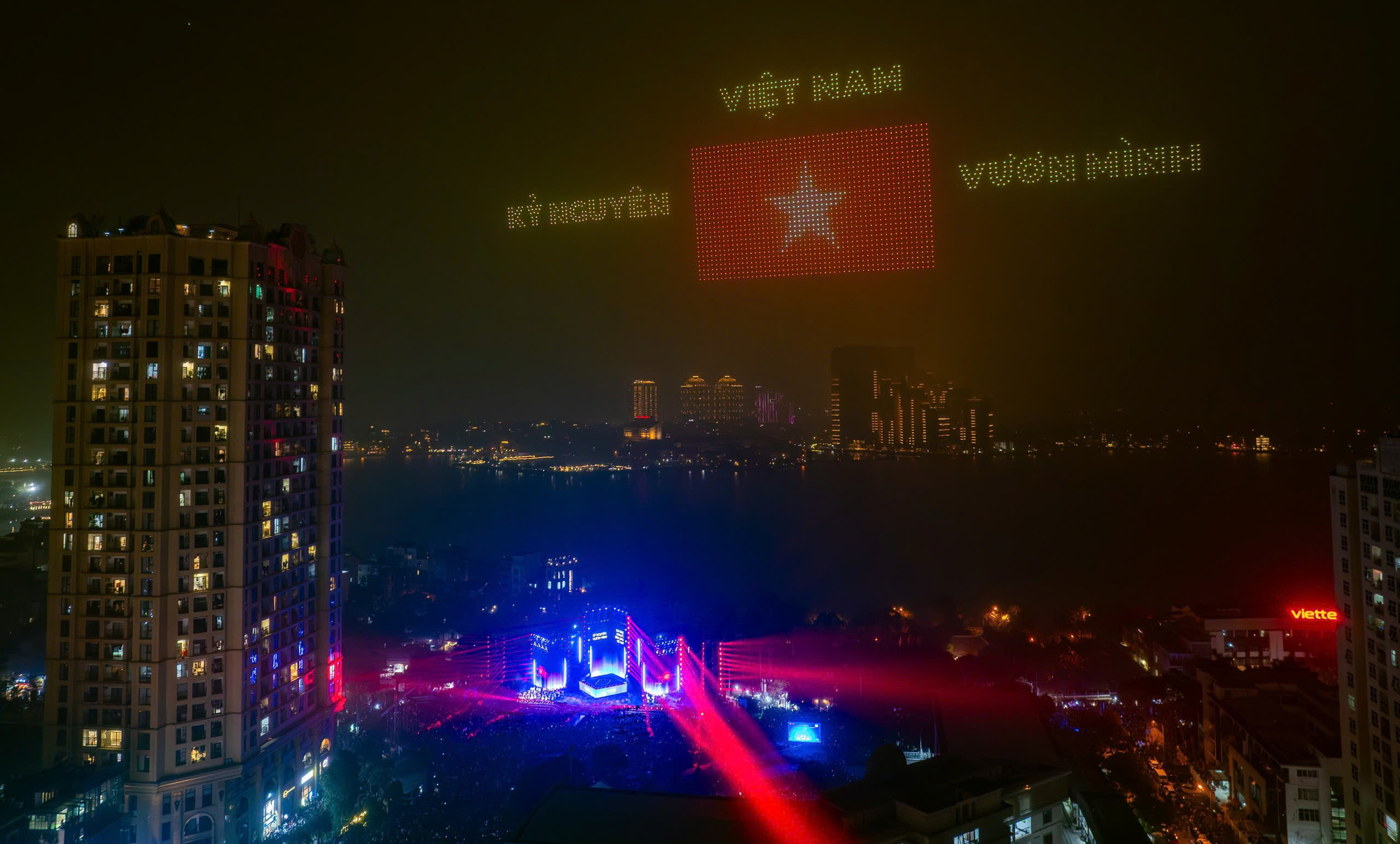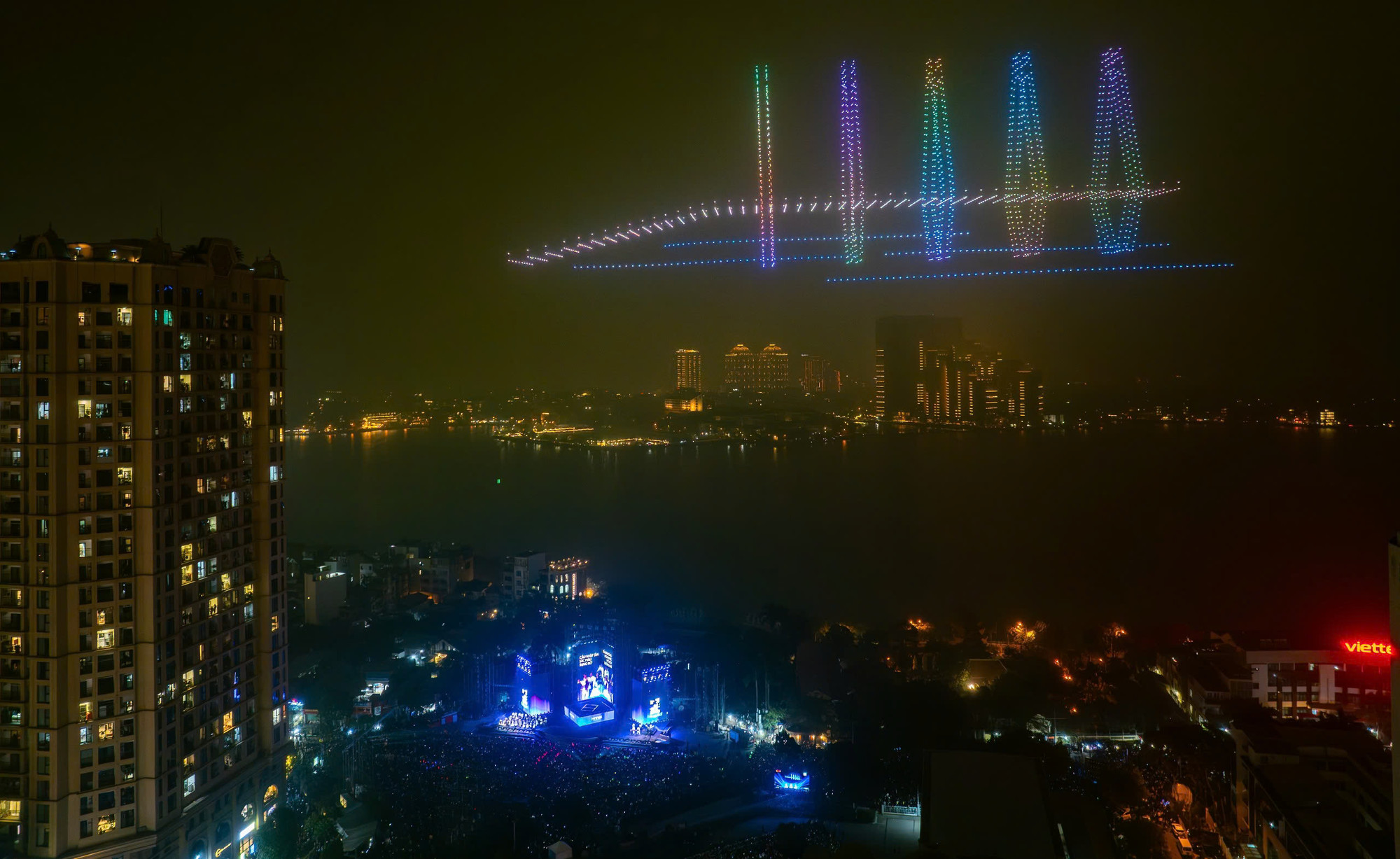 Khi đang hòa mình với màn trình diễn âm nhạc đỉnh cao, hàng chục vạn khán giả Thủ đô tiếp tục vỡ òa khi 2025 drone lighting cất cánh, "họa hình" di sản trên nền trời đêm hồ Tây lộng gió.