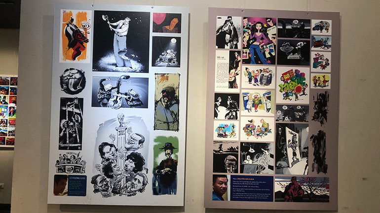 | Một số tác phẩm minh họa báo chí trưng bày tại triển lãm. |