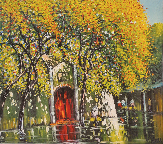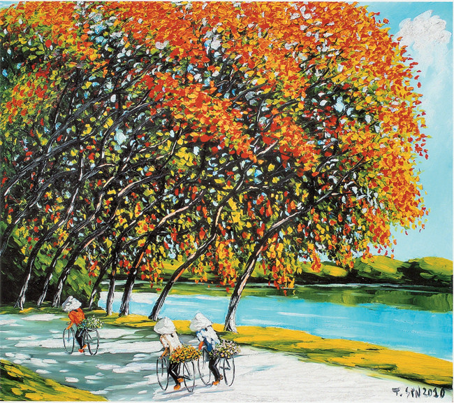 2. Tôi ngắm nhìn những vạt hoa tím trải dài trong bức tranh xế bên trái tường, đối ngược với bức tranh ngay trước mắt tôi, một góc thẳng đứng và hồng rực cả cây hoa không thể đặt tên, rủ xuống một mái cổng lợp lá giữa con dốc nhỏ, cảnh huống có lẽ chỉ có trong tưởng tượng của cô gái trẻ về một không gian gợi cảm giác hạnh phúc. Vạt hoa tím kia có chút gì đó mang tính điện ảnh, giống với nhiều bức tranh thường thấy của Lê Thanh Sơn. “Đúng là tranh của tôi ít nhiều có chất xi-nê, khiến nó khác tranh của nhiều người.”