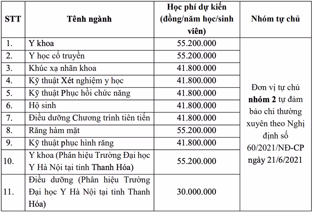 Những ngành có mức học phí cao nhất 55,2 triệu đồng/năm học là: Y khoa, Y khoa phân hiệu Thanh Hóa, Y học cổ truyền, Răng hàm mặt.