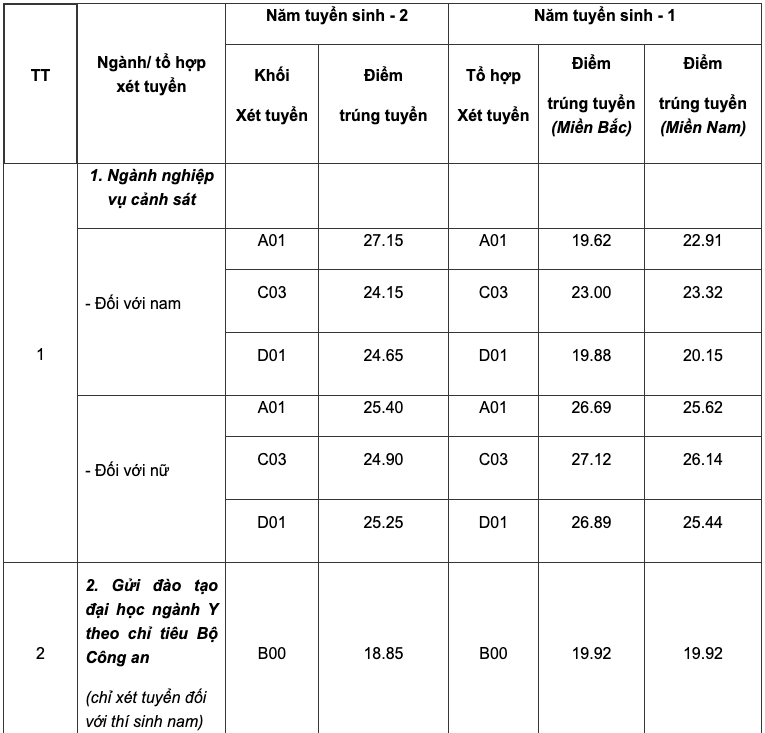 Điểm trúng tuyển hai năm gần nhất của Học viện Cảnh sát nhân dân (Sử dụng kết quả thi kỳ thi THPT quốc gia):