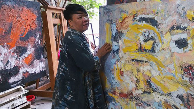 Họa sĩ Trần Thị Thu bên tác phẩm của mình.