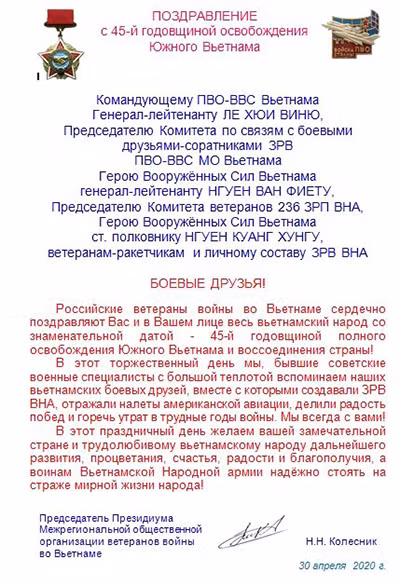 Thư chúc mừng bạn chiến đấu cũ tại Việt Nam của ông N. Kolesnik, Chủ tịch Hội Cựu chuyên gia quân sự Nga từng chiến đấu tại Việt Nam, nhân ngày 30-4-2020. (Ảnh do ông N. Kolesnik cung cấp).