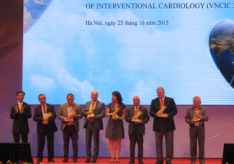 Đại diện ban tổ chức, PGS-TS Nguyễn Quang Tuấn, Chủ tịch Hội Tim mạch Hà Nội, trao kỷ niệm chương cho các chuyên gia trong nước và quốc tế đã có nhiều đóng góp trong phát triển tim mạch can thiệp tại Việt Nam (Ảnh: Ngân Anh).