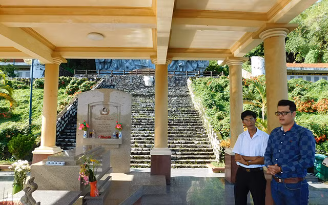 Thầy giáo trẻ Nguyễn Tấn Đạt (bên phải) tình nguyện làm thuyết minh bên mộ chị Sứ mỗi khi có đoàn viếng thăm.