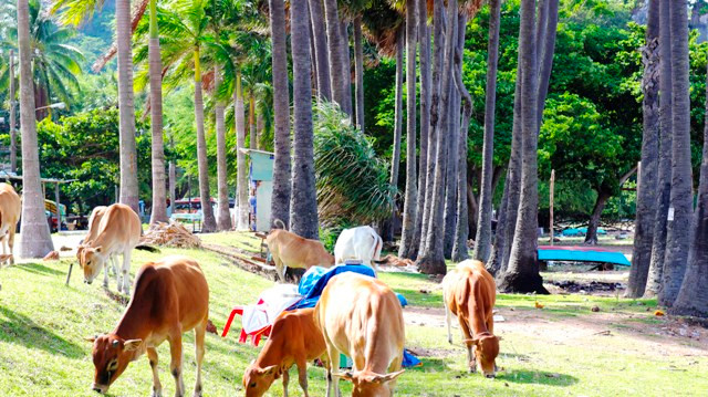 Qua cổng khu du lịch, xe chúng tôi vào một khu vực rộng và thoáng. Phía bên trái hướng vào là trụ sở Ban quản lý khu du lịch. Cách đó là khoảng đất rộng, cỏ dại, sình lầy, phân bò… dành cho các loại phương tiện cơ giới lớn đậu đổ khách xuống. Bên phải là hàng cây cao vút, một đàn bỏ thản nhiên gặm cỏ, xa hơn là bãi biển, cát vàng thơ mộng.