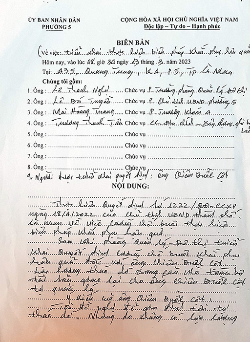 Biên bản ghi nhận việc cưỡng chế nhà vi phạm đối với ông Cột vào sáng 13/3/2023 có ý kiến đề nghị gia đình ông tự tháo dỡ.