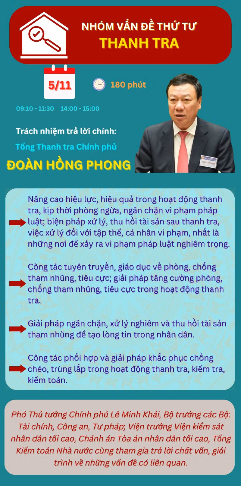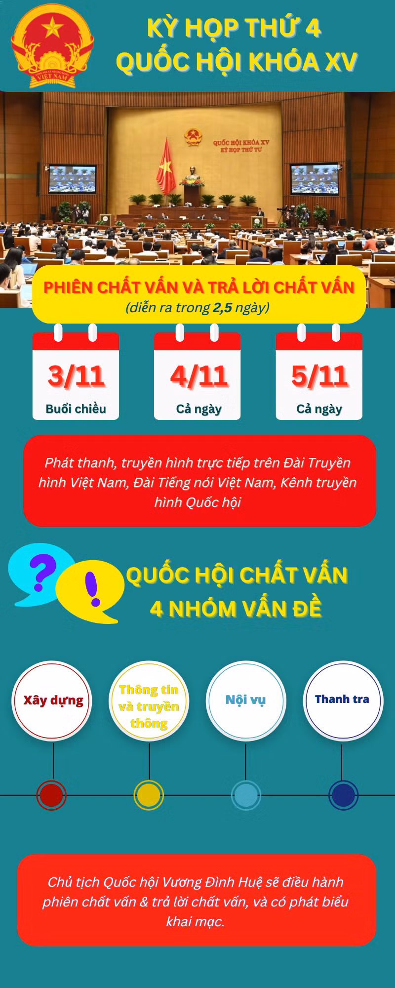 Phiên chất vấn và trả lời chất vấn tại Kỳ họp thứ 4, Quốc hội khóa XV dự kiến diễn ra từ ngày 3 đến 5/11, với 4 nhóm vấn đề được lựa chọn chất vấn là xây dựng, thông tin và truyền thông, nội vụ và thanh tra.