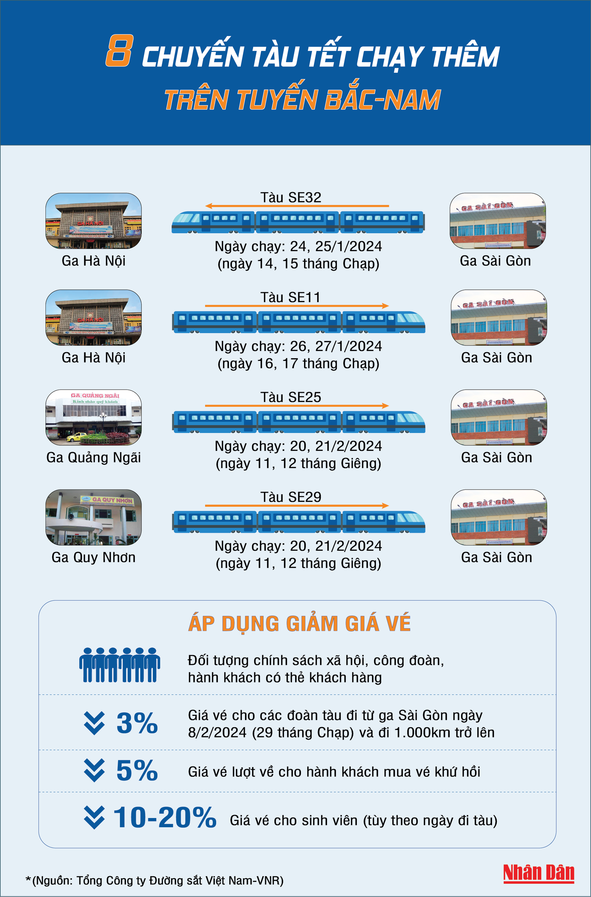 Đường sắt tiếp tục lập thêm 8 chuyến tàu tuyến bắc-nam, cung cấp hơn 4.000 chỗ phục vụ người dân đi lại dịp Tết.