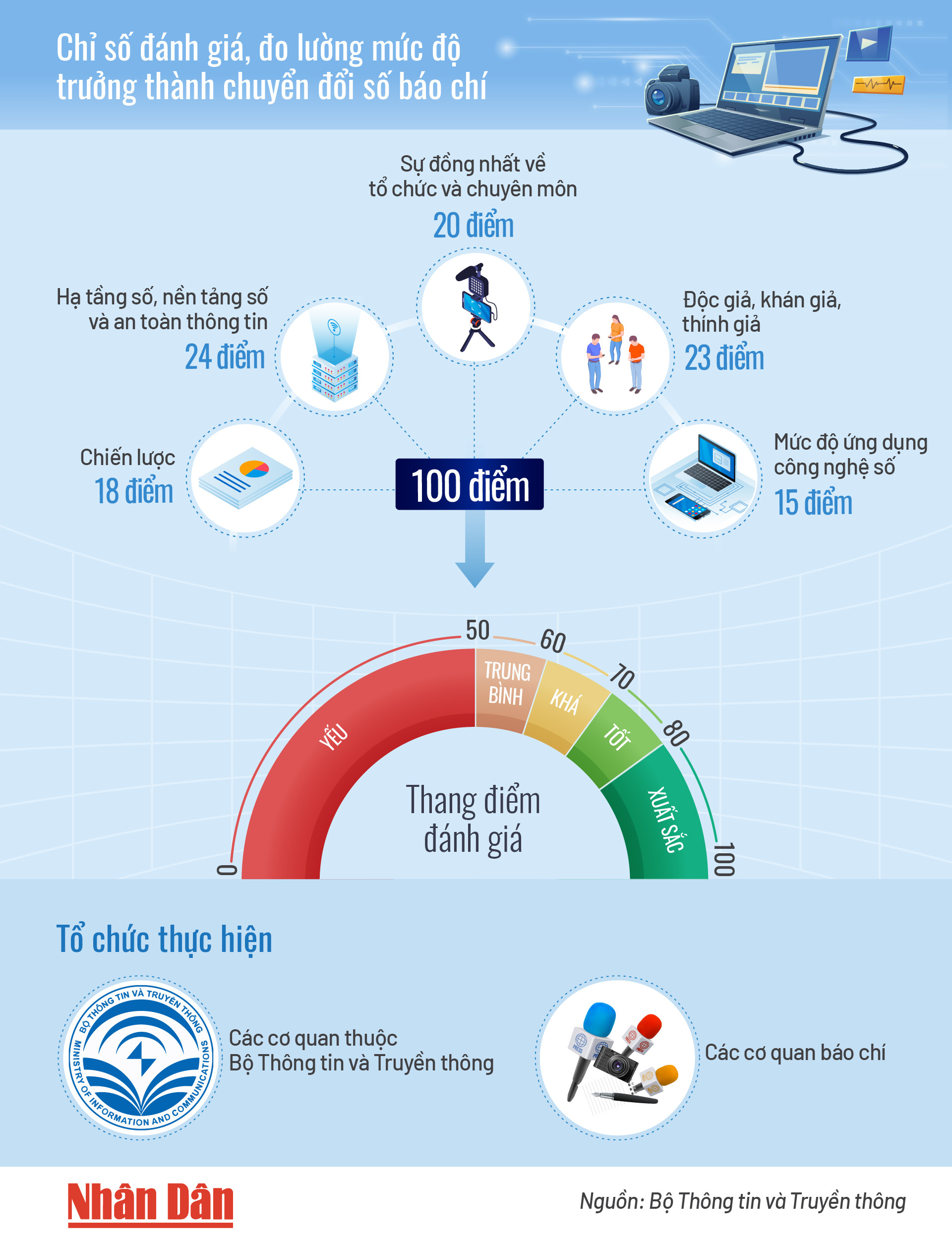 Ngày 2/6, Bộ Thông tin và Truyền thông ban hành Bộ Chỉ số đánh giá, đo lường mức độ trưởng thành chuyển đổi số báo chí. Theo đó, thang điểm 100 được tính dựa trên 5 tiêu chí khác nhau. Tòa soạn sẽ bị xếp hạng yếu nếu tổng điểm không đạt trên 50 điểm.
