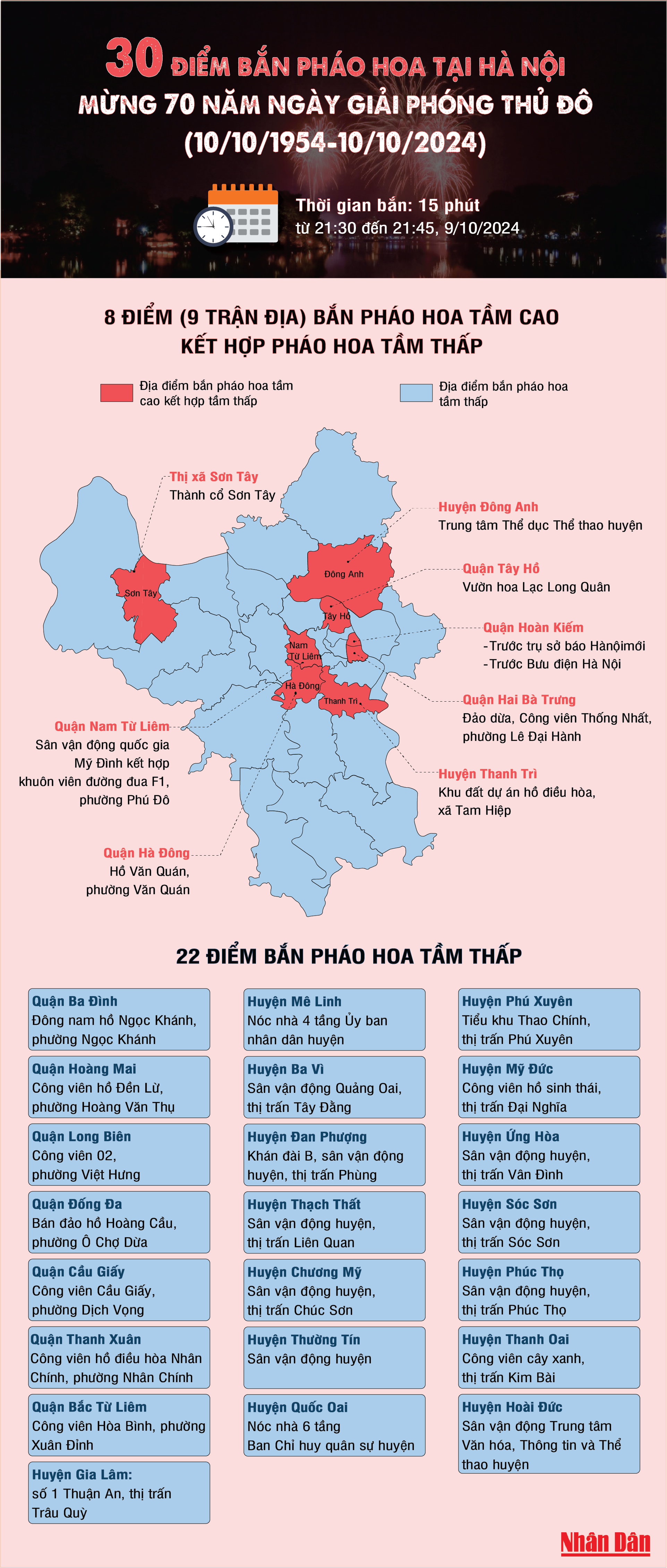 [Infographic] Chi tiết 30 điểm bắn pháo hoa mừng Ngày Giải phóng Thủ đô
