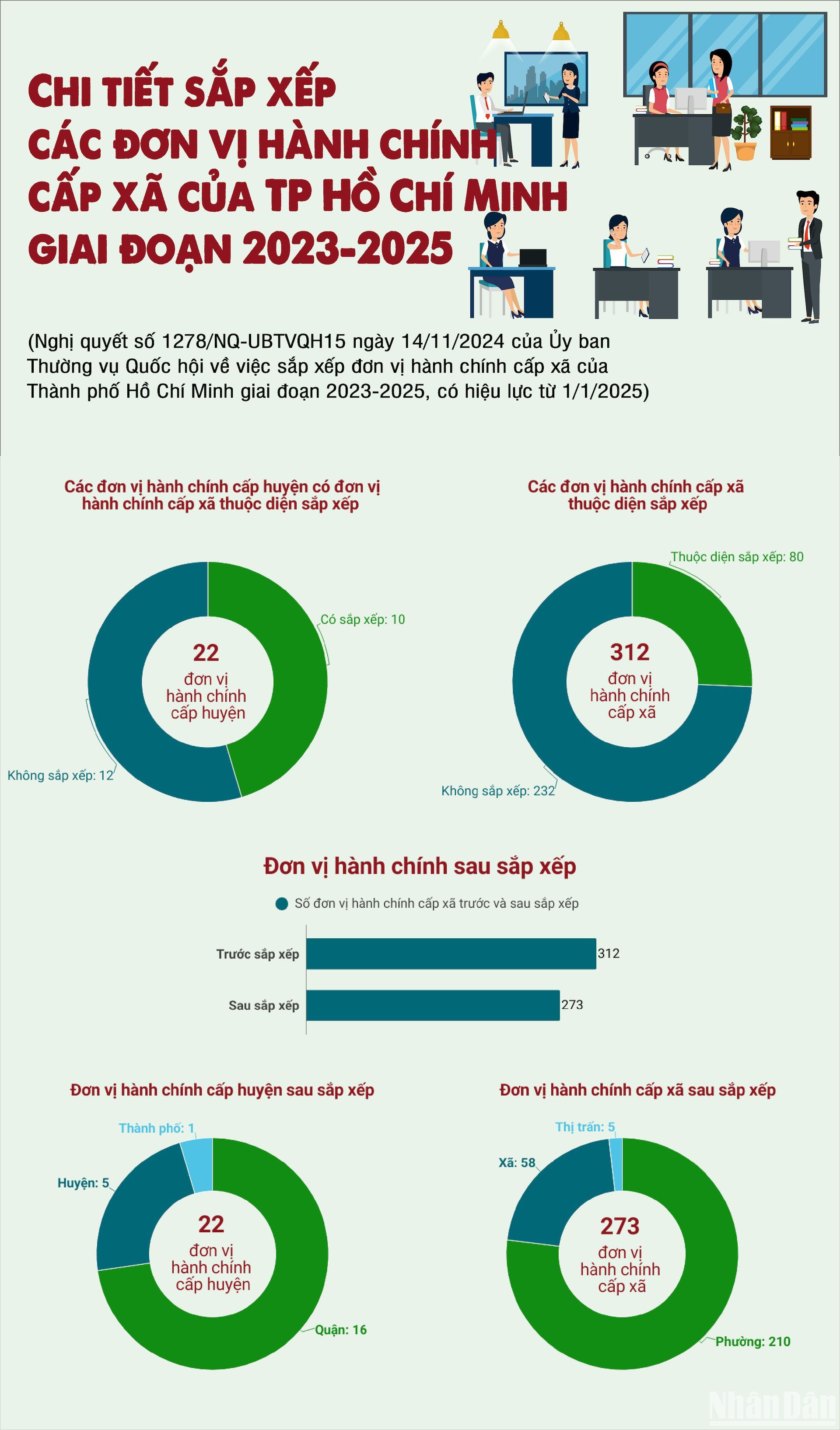 Theo Nghị quyết số 1278/NQ-UBTVQH15 ngày 14/11/2024 của Ủy ban Thường vụ Quốc hội về việc sắp xếp đơn vị hành chính cấp xã của Thành phố Hồ Chí Minh giai đoạn 2023-2025, sau khi sắp xếp, Thành phố Hồ Chí Minh có 22 đơn vị hành chính cấp huyện, gồm 16 quận, năm huyện và một thành phố; 273 đơn vị hành chính cấp xã, gồm 210 phường, 58 xã và năm thị trấn.