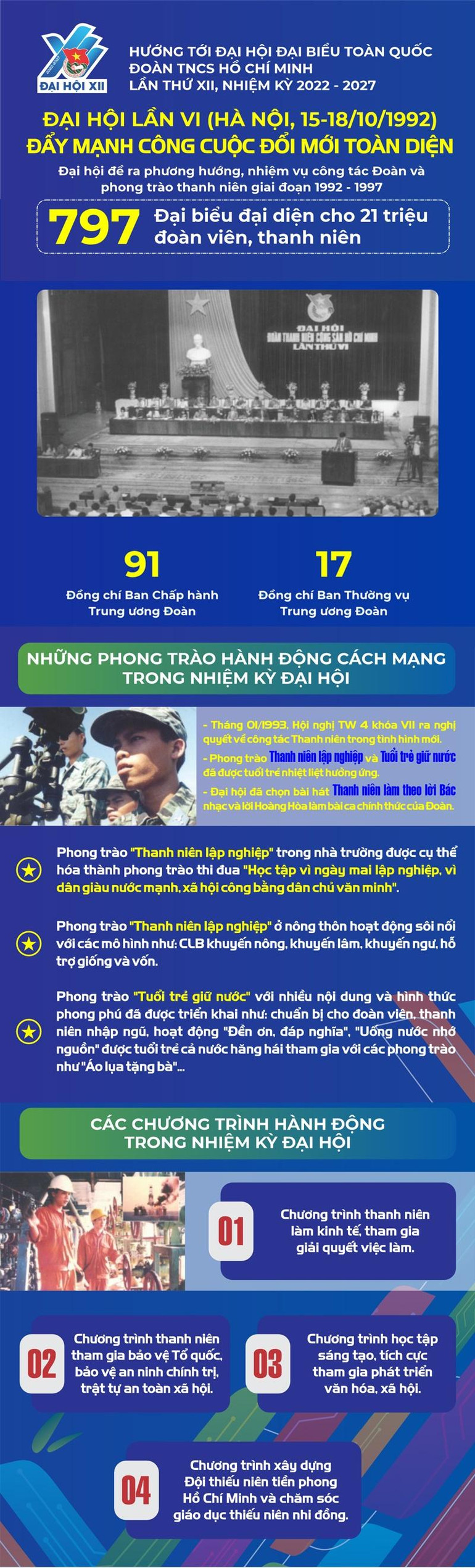 Đại hội đại biểu toàn quốc Đoàn Thanh niên Cộng sản Hồ Chí Minh diễn ra tại Thủ đô Hà Nội từ ngày 15 đến 18/10/1992 với 797 đại biểu tham dự. Sau Đại hội, vào tháng 2/1993, Hội nghị lần thứ II Ban Chấp hành Trung ương Đoàn khóa VI đã quyết định triển khai 2 phong trào lớn: “Thanh niên lập nghiệp”, “Tuổi trẻ giữ nước”, được đông đảo đoàn viên, thanh niên cả nước hưởng ứng sôi nổi.