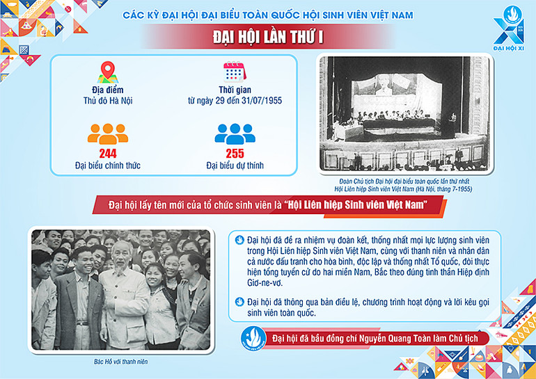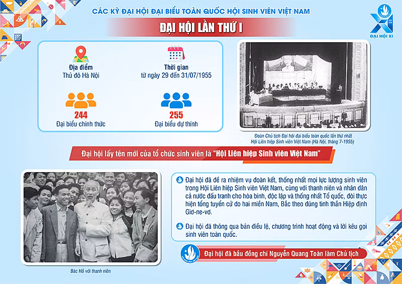Diễn ra tại Thủ đô Hà Nội từ ngày 29 đến 31/7/1955, Đại hội đại biểu toàn quốc Hội Sinh viên Việt Nam lần thứ nhất có 244 đại biểu chính thức và 255 đại biểu dự thính, đã thống nhất lấy tên mới của tổ chức sinh viên là "Hội Liên hiệp Sinh viên Việt Nam".