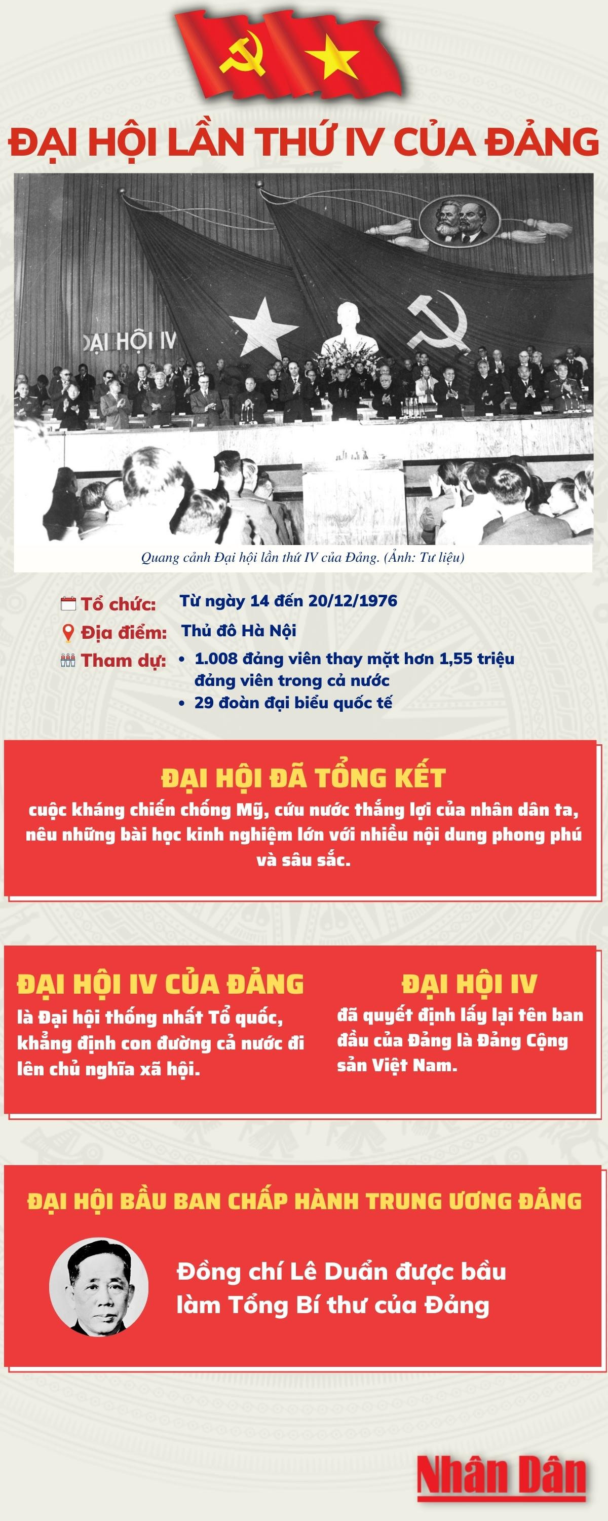 Đại hội lần thứ IV của Đảng được tổ chức từ ngày 14 đến 20/12/1976 tại Hà Nội với sự tham dự của 1.008 đảng viên thay mặt hơn 1,55 triệu đảng viên trong cả nước. Dự Đại hội có 29 đoàn đại biểu quốc tế.