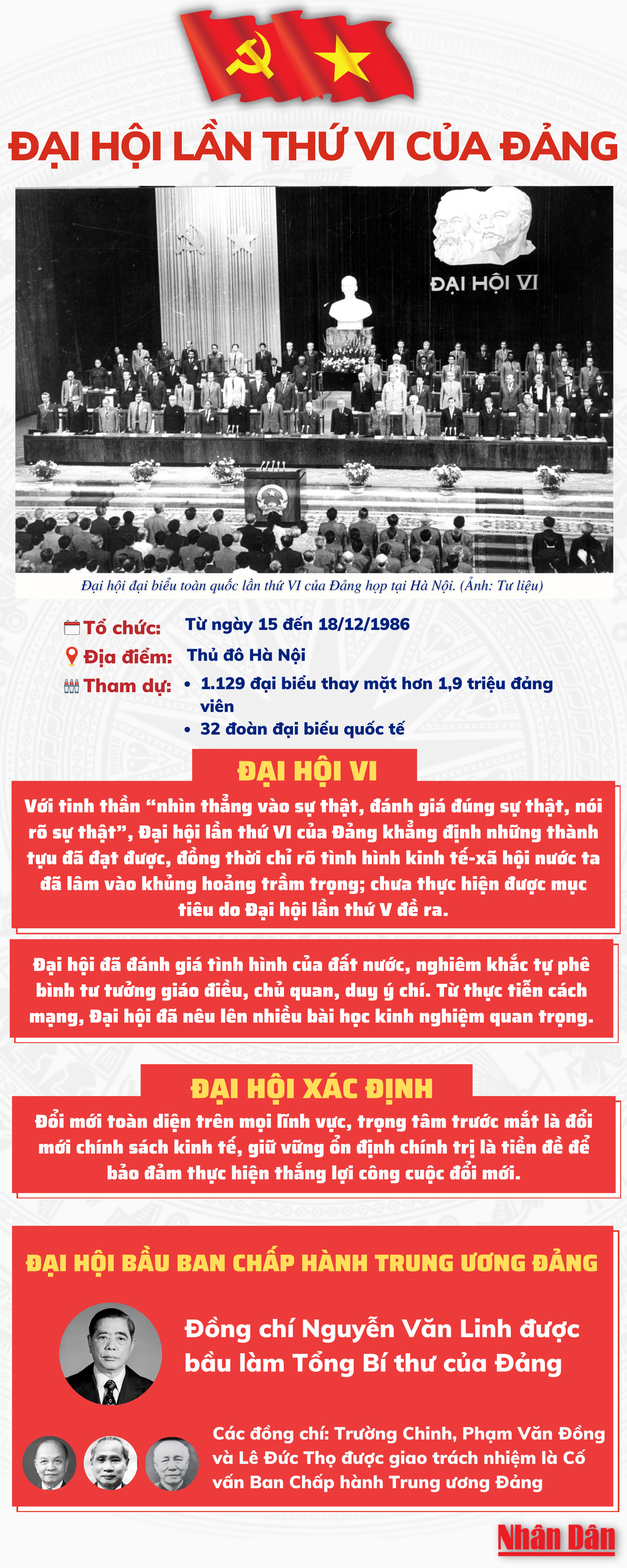Đại hội lần thứ VI của Đảng được tổ chức từ ngày 15 đến 18/12/1986 tại Hà Nội với sự tham dự của 1.129 đại biểu thay mặt hơn 1,9 triệu đảng viên. Dự Đại hội có 32 đoàn đại biểu quốc tế.