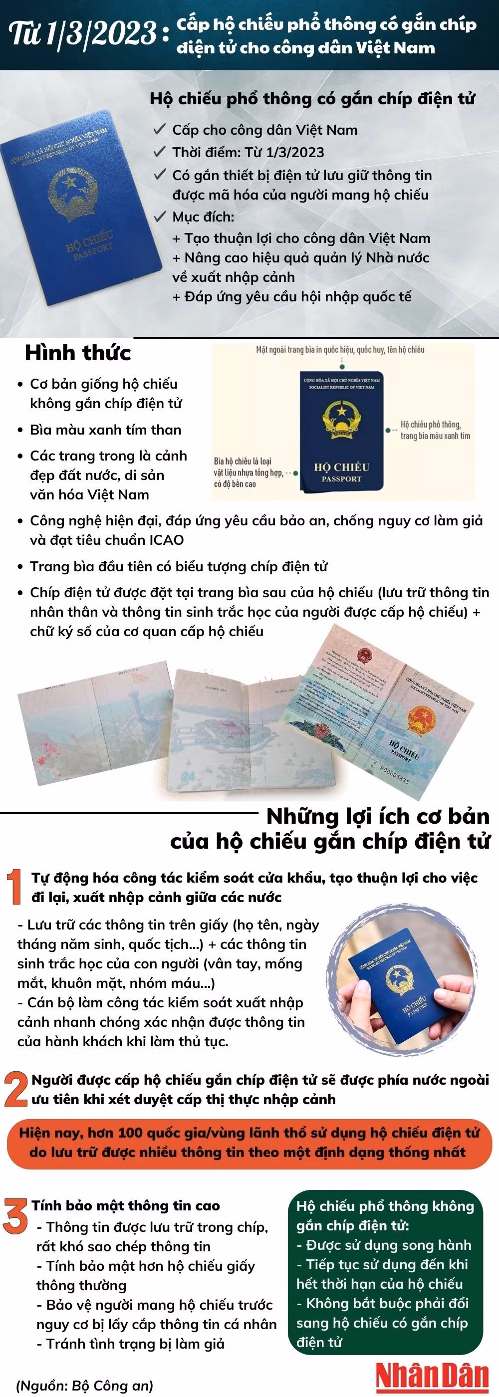 Từ ngày 1/3 tới, công dân Việt Nam sẽ được cấp hộ chiếu phổ thông có gắn chíp điện tử. Loại hộ chiếu này có tính bảo mật thông tin cao hơn hộ chiếu giấy thông thường, tránh nguy cơ bị lấy cắp thông tin cá nhân của người được cấp.