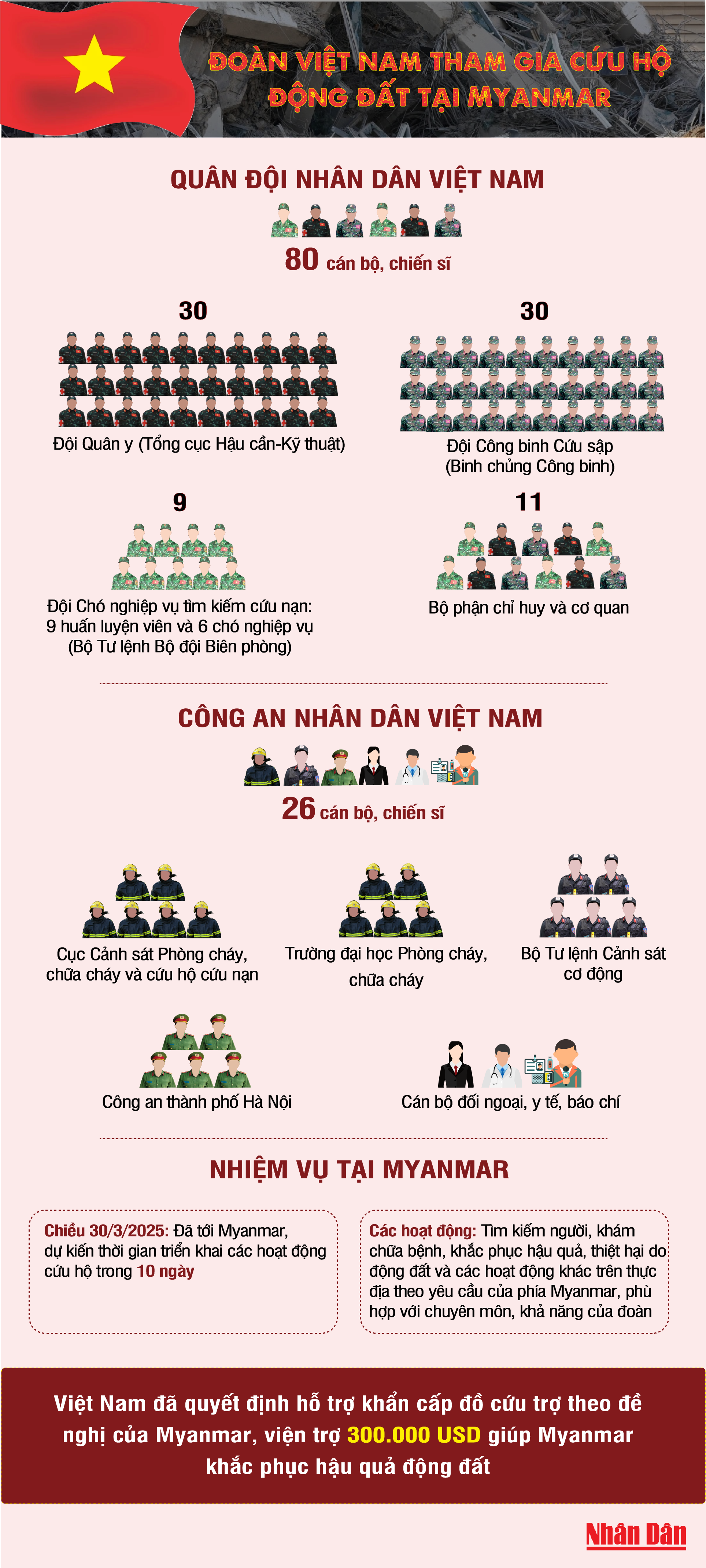[Infographic] Đoàn cán bộ, chiến sĩ Việt Nam tham gia cứu hộ, khắc phục động đất tại Myanmar