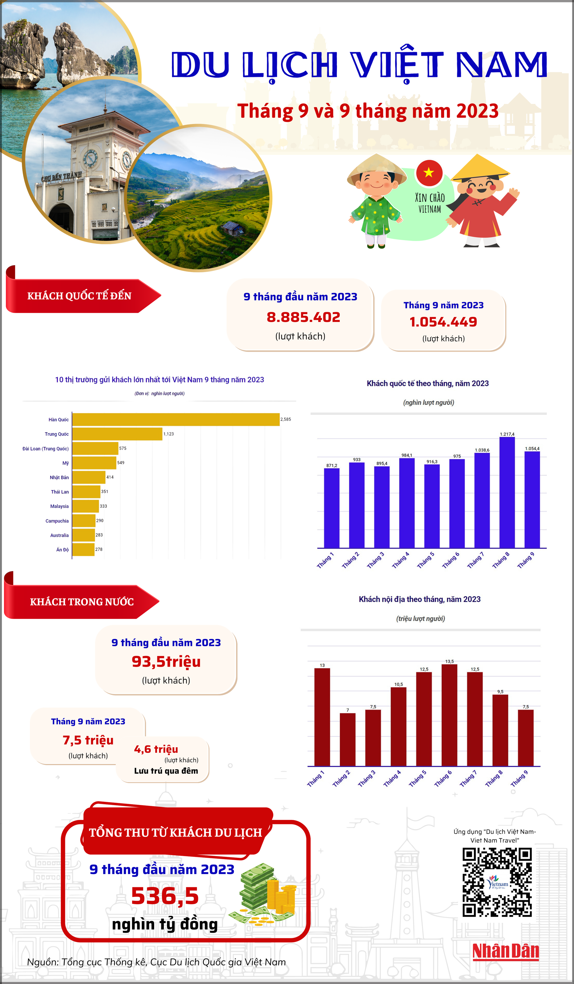 Tháng 9/2023, du lịch Việt Nam đón trên 1,05 triệu lượt khách quốc tế, ghi nhận tháng thứ 3 liên tiếp Du lịch Việt Nam đón trên 1 triệu lượt khách quốc tế. Tính chung 9 tháng, tổng lượng khách quốc tế đạt 8,9 triệu lượt. Du lịch Việt Nam về đích sớm mục tiêu đón 8 triệu khách quốc tế năm 2023.