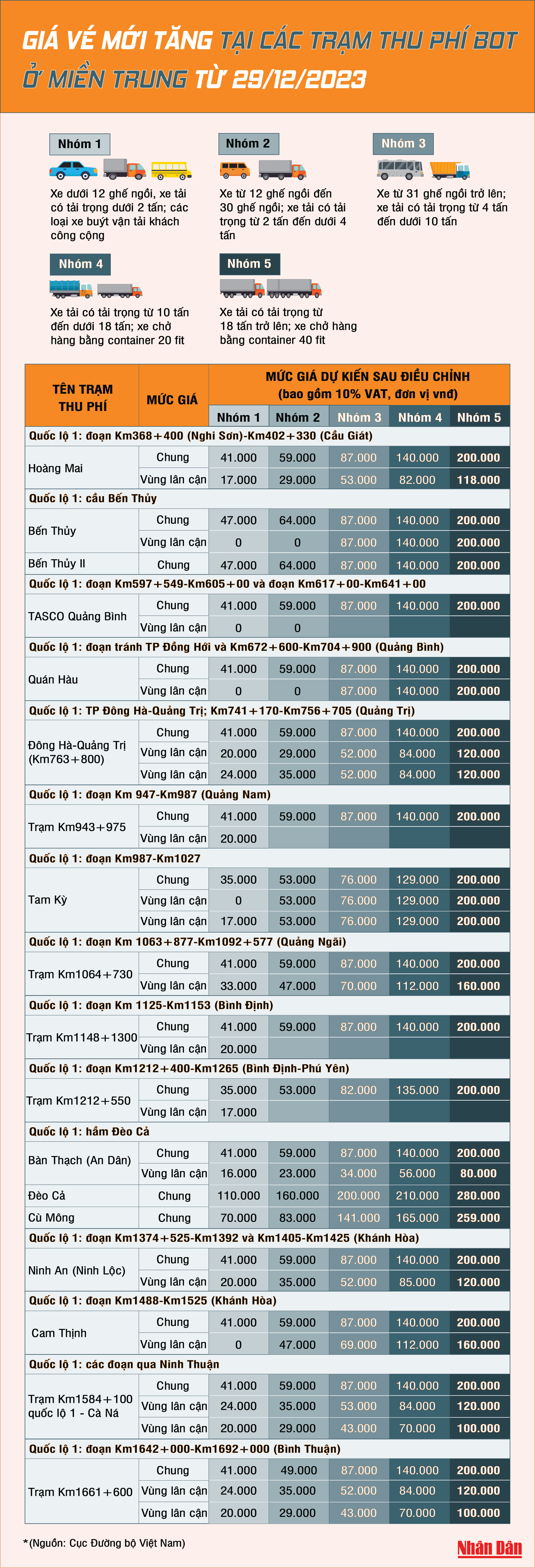 [Infographic] Giá vé mới tăng tại các trạm thu phí BOT ở miền trung từ ngày 29/12/2023
