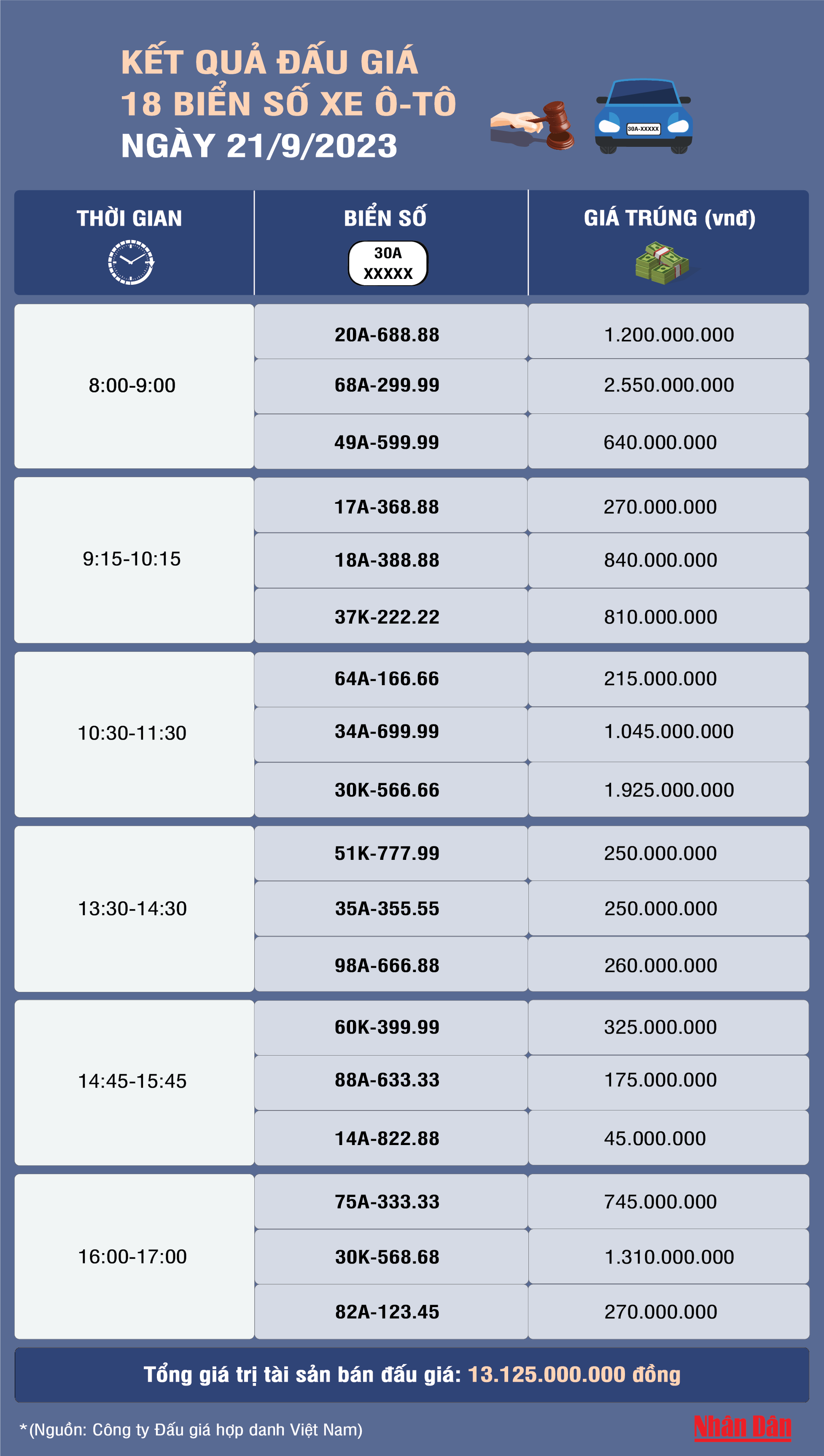 [Infographic] Kết quả đấu giá 18 biển số xe ô-tô ngày 21/9/2023