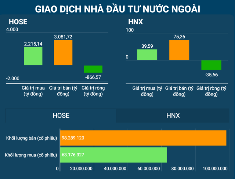 Nhà đầu tư nước ngoài tiếp tục chuỗi bán ròng khá đột biến trên HoSE với giá trị 866,57 tỷ đồng trong phiên hôm nay, bán ròng khá mạnh ở nhóm cổ phiếu ngân hàng, chứng khoán, thép; bán ròng trên HNX với giá trị 35,66 tỷ đồng.