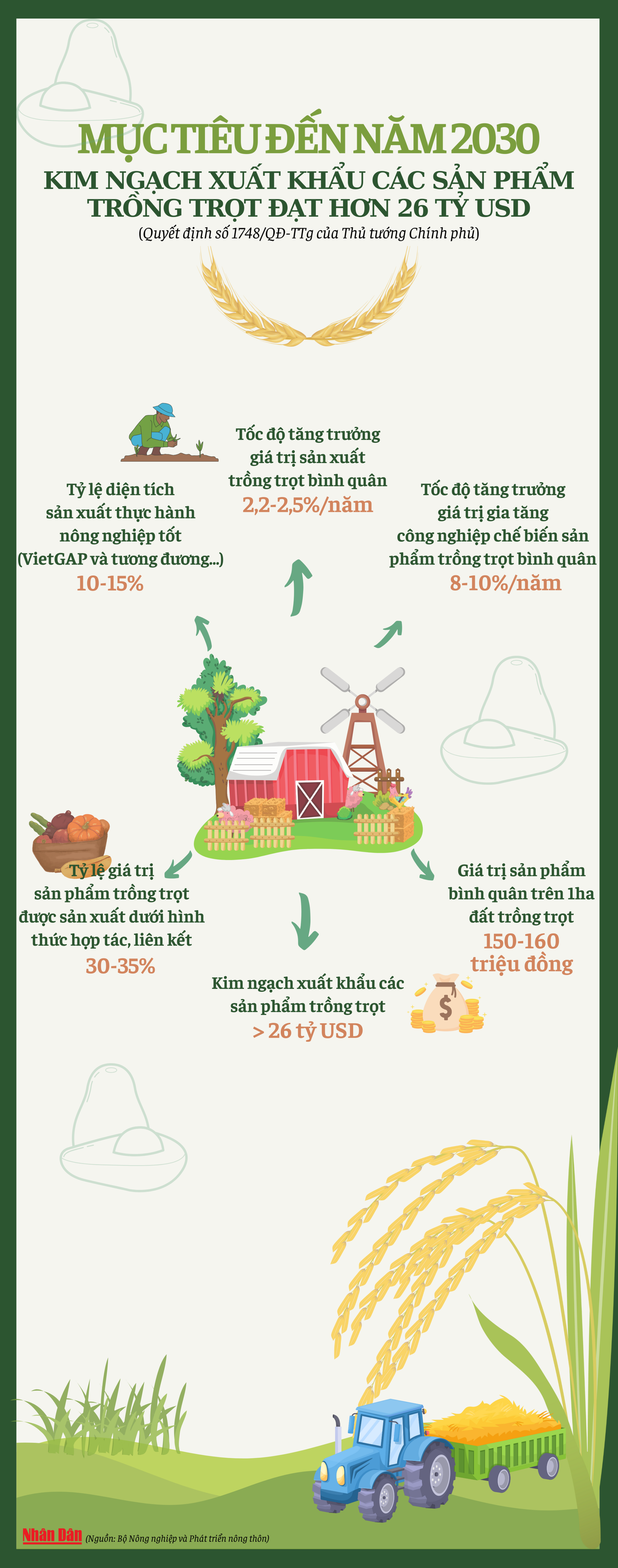 Mục tiêu đến năm 2030, tốc độ tăng trưởng giá trị sản xuất trồng trọt bình quân 2,2-2,5%/năm; tốc độ tăng trưởng giá trị gia tăng công nghiệp chế biến sản phẩm trồng trọt bình quân 8-10%/năm; kim ngạch xuất khẩu các sản phẩm trồng trọt đạt hơn 26 tỷ USD.
