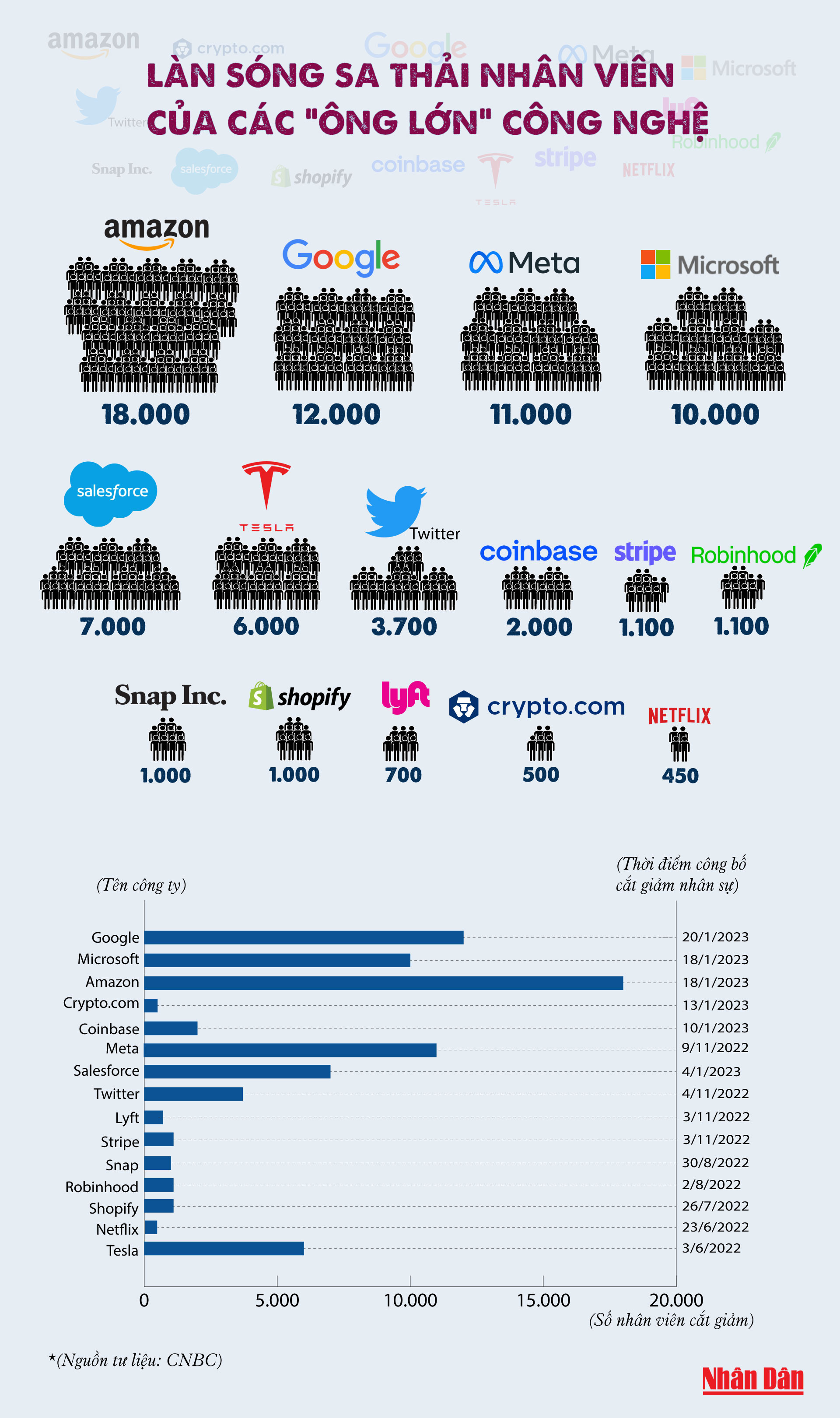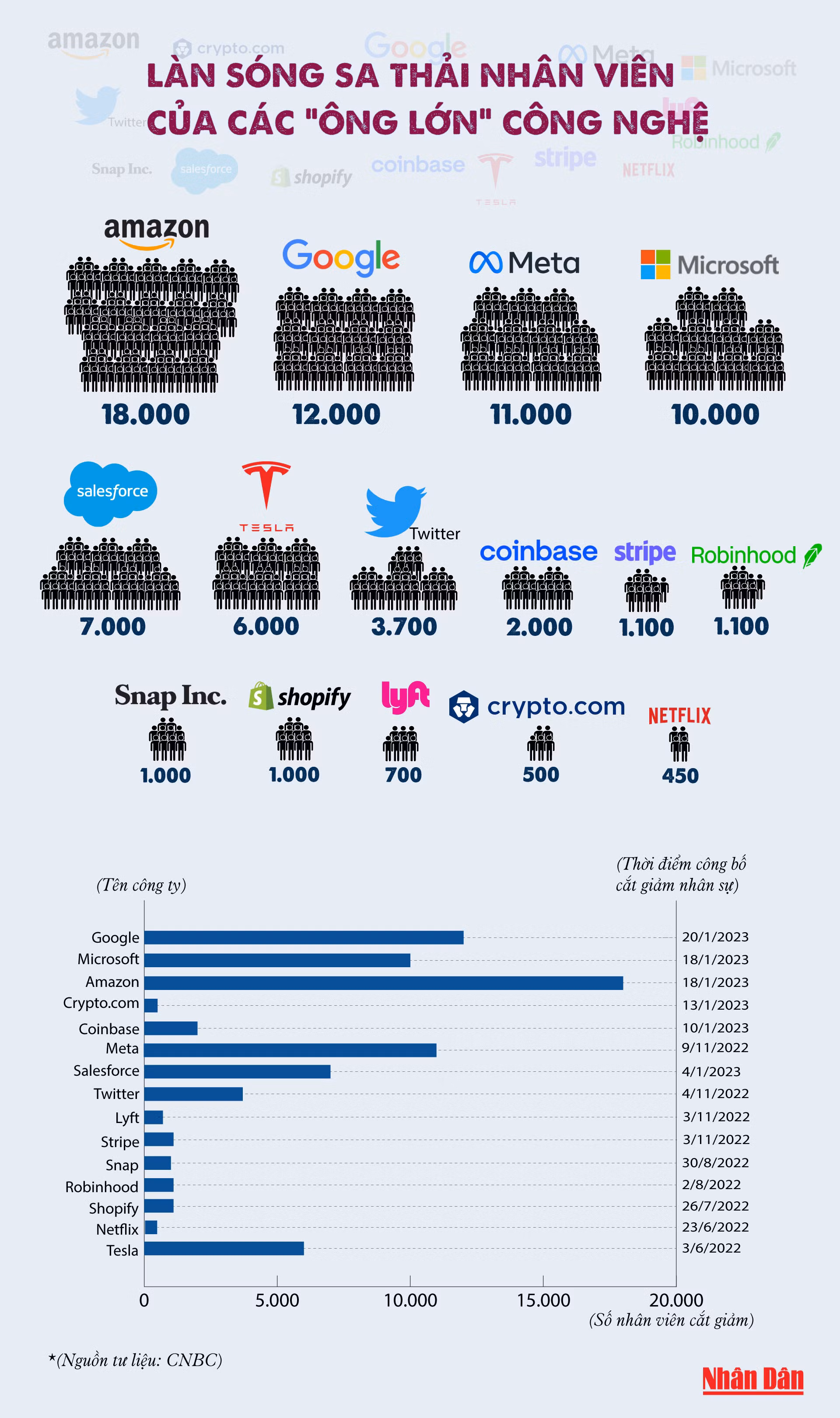 Tháng 1/2023, Google công bố kế hoạch sa thải 12.000 nhân viên, Microsoft công bố sẽ sa thải 10.000 nhân viên, trong khi Amazon cũng bắt đầu một đợt cắt giảm nhân sự mới lên tới 18.000 người. Chỉ tính từ tháng 6 năm ngoái đến nay, các công ty công nghệ đã sa thải và công bố kế hoạch sa thải tới hơn 70 nghìn nhân viên.