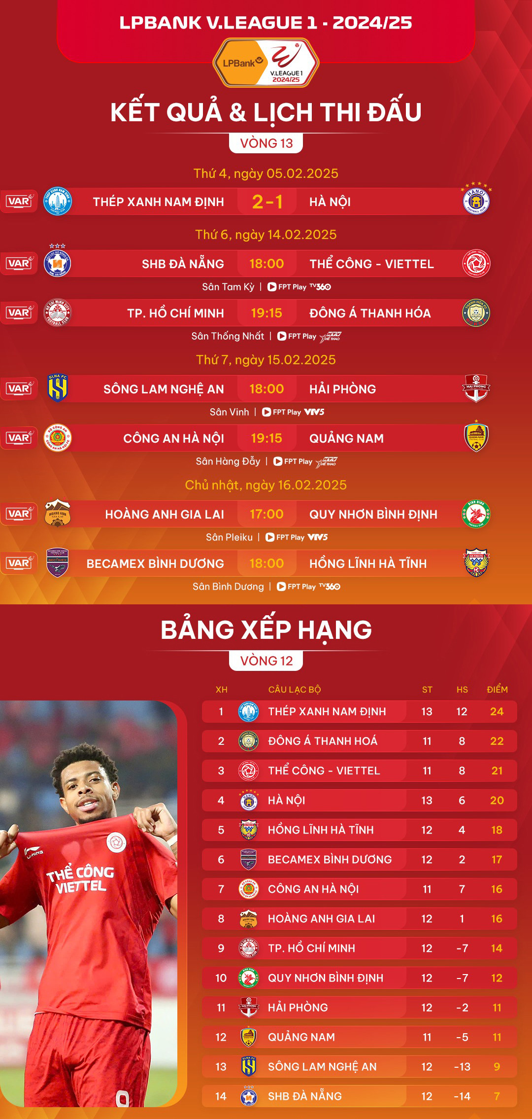 Nối tiếp vòng 12, vòng 13 V-League 2024/25 sẽ diễn ra từ ngày 14/2 đến ngày 16/2 với 6 cặp đấu hấp dẫn (Nam Định và Hà Nội đã đá sớm trước đó). Vòng đấu được dự đoán sẽ là những cuộc cạnh tranh vô cùng hấp dẫn ở nhóm đầu, nhóm giữa cũng như nhóm cuối trên Bảng xếp hạng.