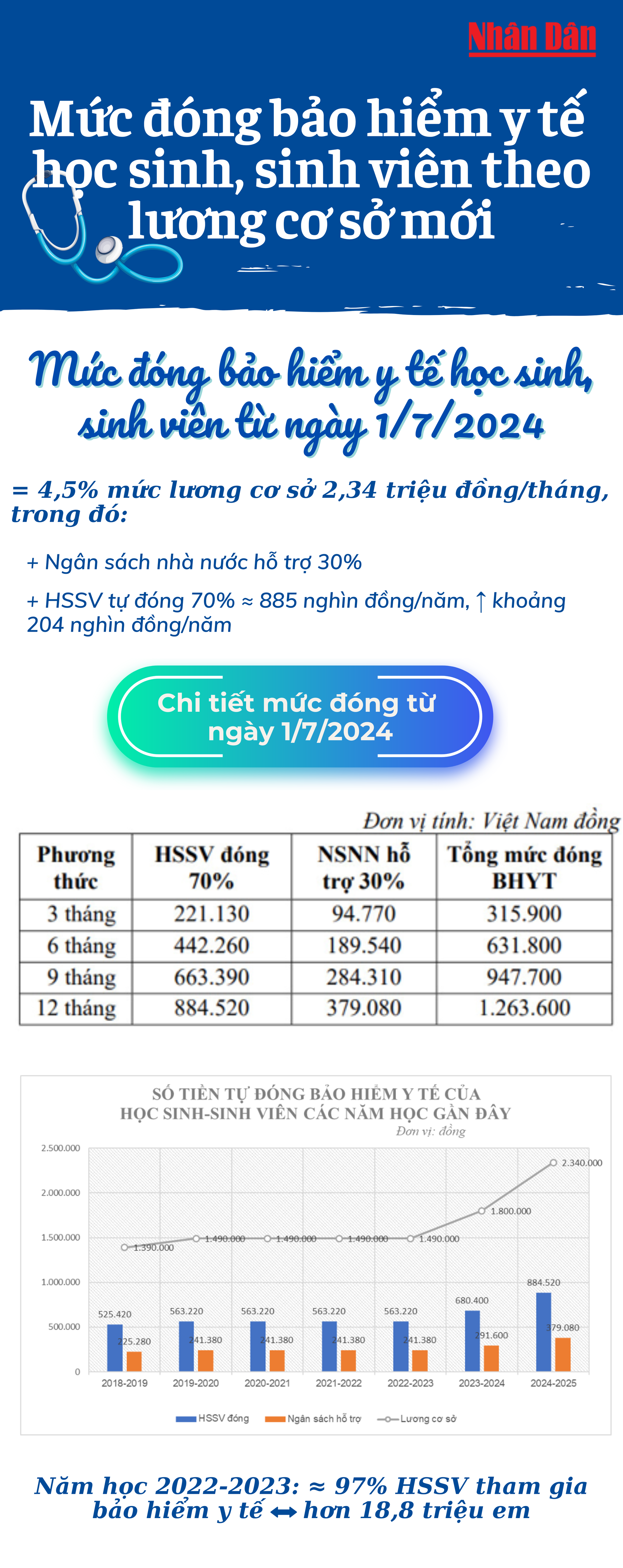 Áp dụng theo mức lương cơ sở mới 2,34 triệu đồng/tháng, mức đóng bảo hiểm y tế của nhóm học sinh-sinh viên cũng tăng theo. Theo đó, từ ngày 1/7/2024, học sinh-sinh viên tham gia bảo hiểm y tế phải đóng gần 885 nghìn đồng/năm. Ngân sách nhà nước cũng hỗ trợ 30% mức đóng cho nhóm đối tượng này.