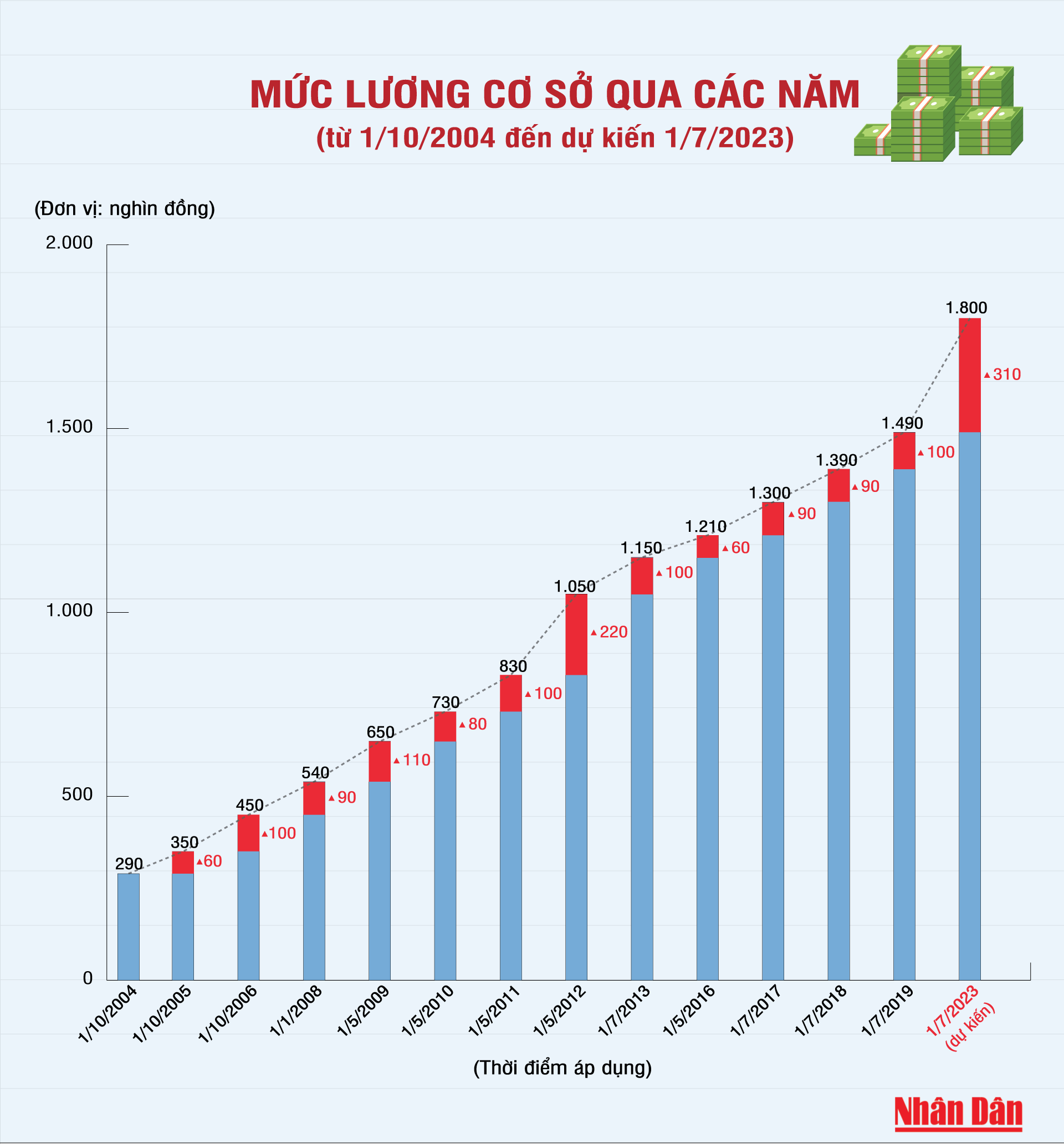 Từ ngày 1/7/2023, lương cơ sở tăng từ 1,49 triệu đồng lên 1,8 triệu đồng/tháng (tăng hơn 310.000 đồng), đây là mức tăng cao nhất trong gần hai thập kỷ. Cùng nhìn lại sự thay đổi của mức lương cơ sở trong gần hai thập kỷ qua.