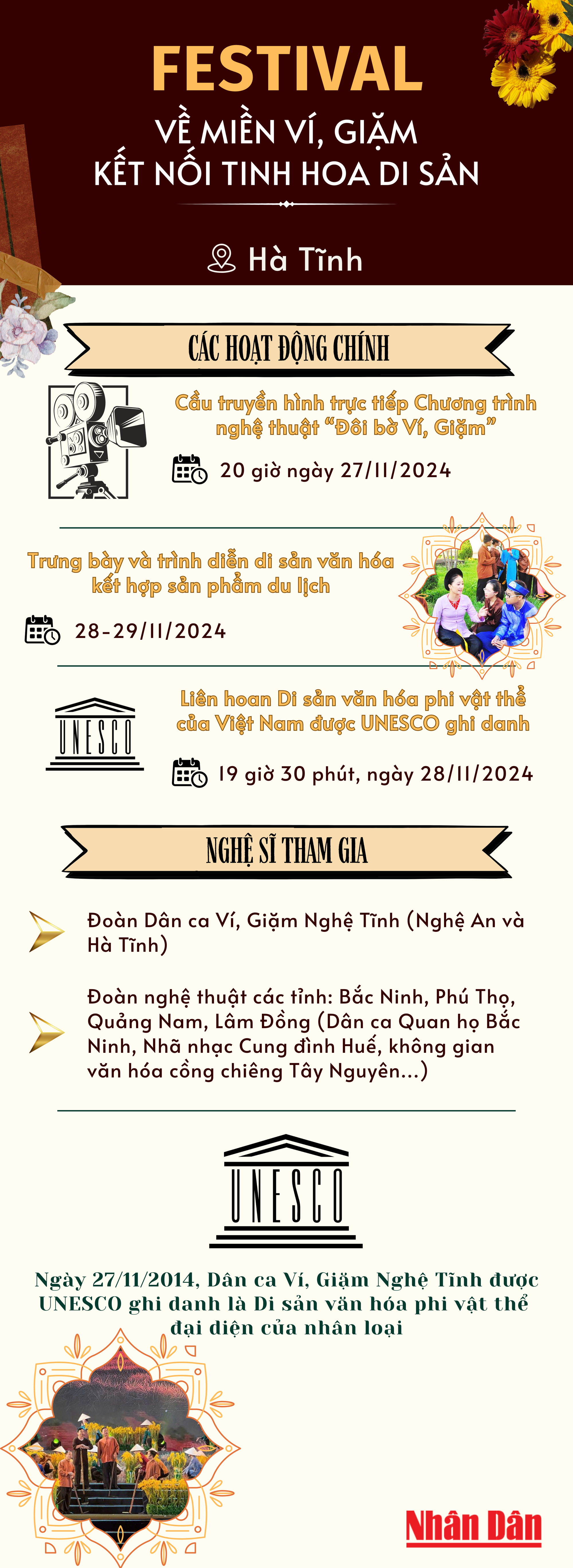 di sản". Chương trình sẽ diễn ra từ ngày 27-30/11/2024 với điểm nhấn là cầu truyền hình trực tiếp Chương trình nghệ thuật “Đôi bờ Ví, Giặm” diễn ra tối 27/11/2024, có sự góp mặt của nhiều đoàn nghệ thuật nổi tiếng.