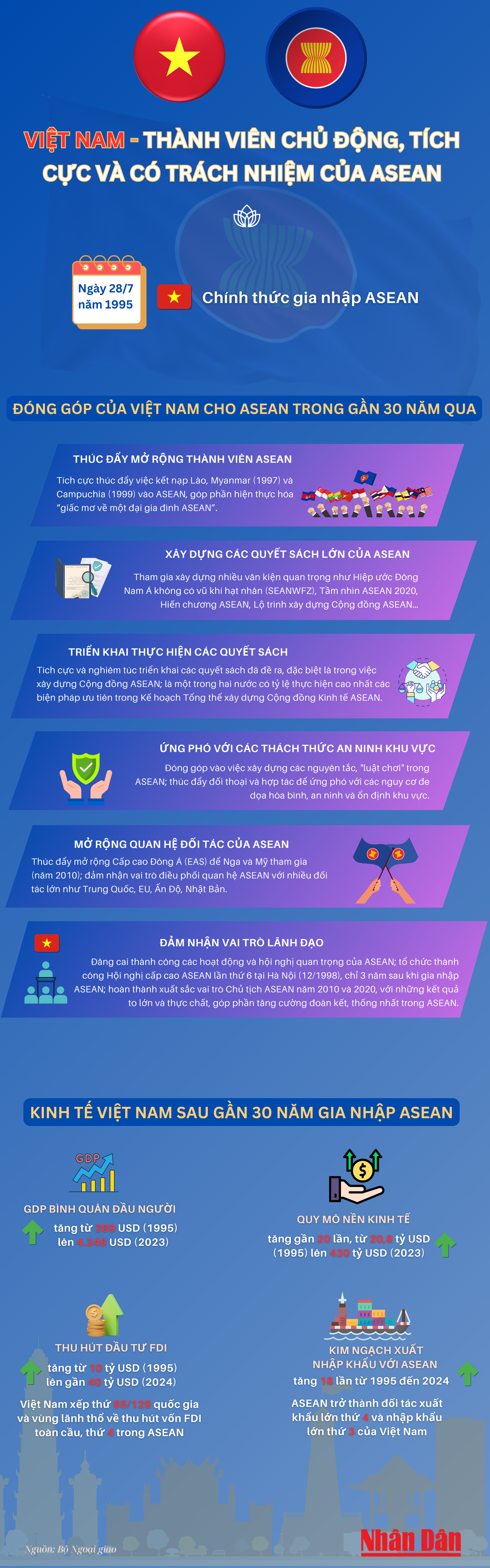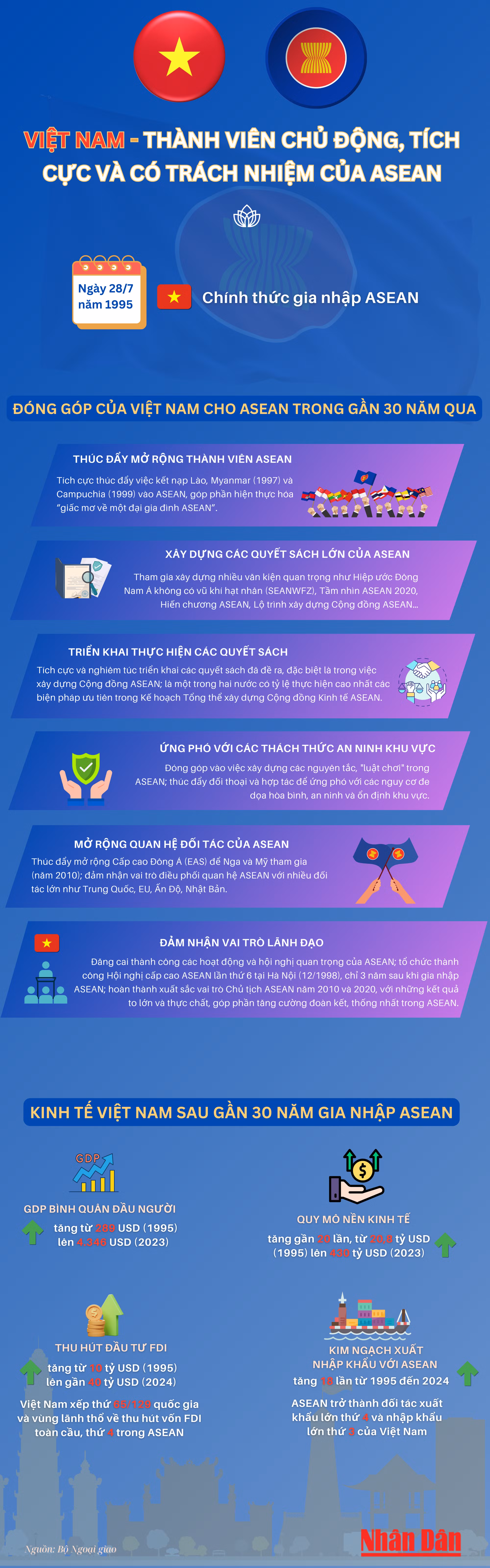 Kể từ khi gia nhập ASEAN ngày 28/7/1995, Việt Nam đã tham gia sâu rộng vào tất cả các lĩnh vực hợp tác theo phương châm “chủ động, tích cực và có trách nhiệm”, đồng thời có những đóng góp quan trọng cho sự trưởng thành và lớn mạnh của ASEAN.