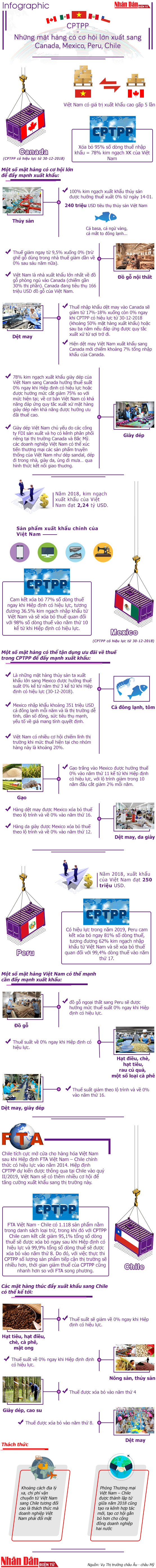 NDĐT - Trong 11 thành viên tham gia CPTPP, có ba nước mà Việt Nam lần đầu tiên có quan hệ FTA là Canada, Mexico và Peru. Đặc biệt, những nước này cùng Chile có cam kết cắt giảm tỷ lệ thuế quan cho hàng hoá Việt Nam rất cao ngay khi Hiệp định CPTPP có hiệu lực: Canada (95%), Chile (95%), Peru (81%) và Mexico (77%).