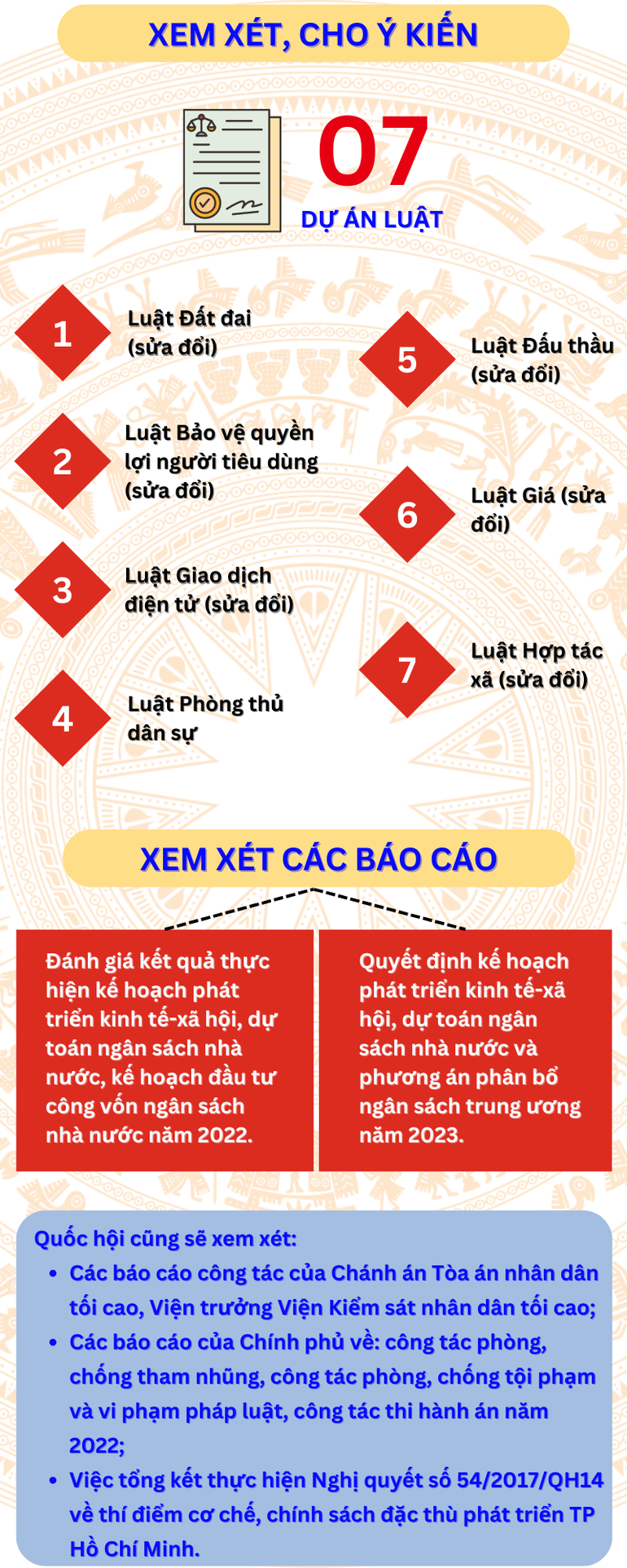 Tại Kỳ họp thứ 4, Quốc hội dự kiến xem xét, thông qua 7 dự án Luật, 3 dự thảo Nghị quyết, đồng thời xem xét, cho ý kiến 7 dự án Luật, trong đó có dự án Luật Đất đai (sửa đổi).