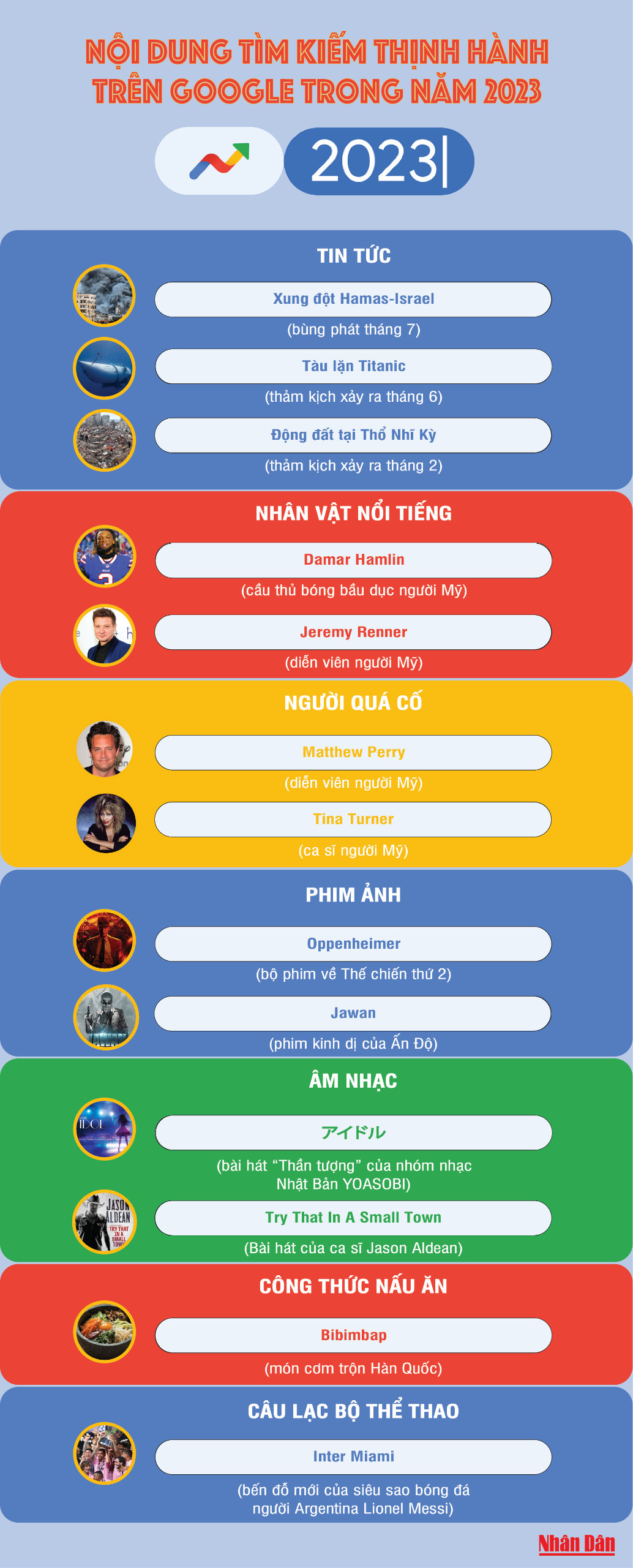 Nội dung về tin tức được tìm kiếm nhiều nhất trên Google trong năm 2023 là cuộc xung đột giữa Hamas và Israel, theo sau là thảm kịch tàu lặn Titan và thảm họa động đất tại Thổ Nhĩ Kỳ và Syria.
