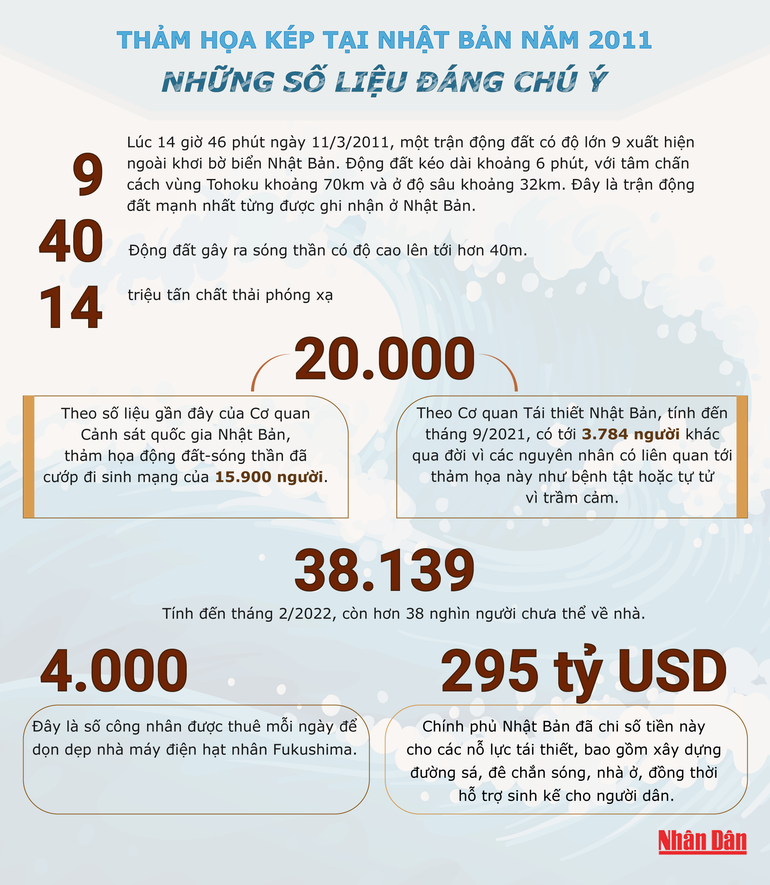 Theo các số liệu thống kê chính thức, thảm họa động đất, sóng thần xảy ra năm 2011 tại Nhật Bản đã cướp đi sinh mạng của khoảng 20.000 người, chủ yếu ở các tỉnh Miyagi, Fukushima và Iwate. Đến nay, Nhật Bản vẫn tiếp tục khắc phục những hậu quả thảm khốc do trận động đất này gây ra.