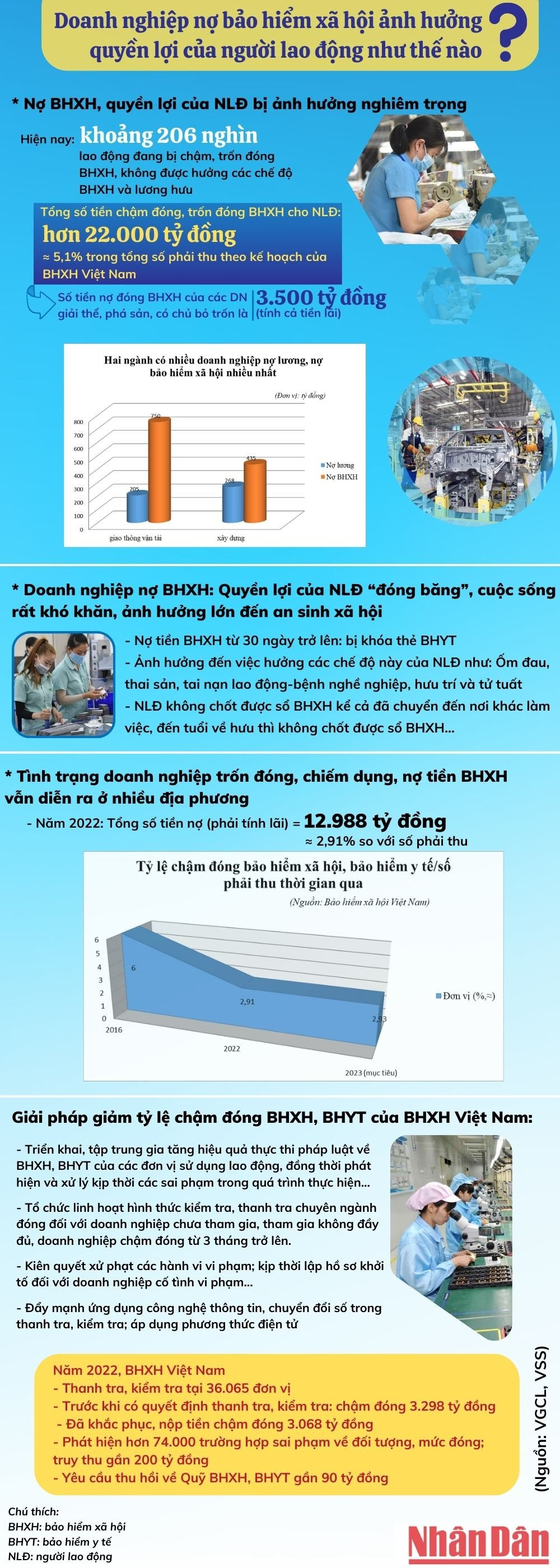 Tình trạng doanh nghiệp nợ bảo hiểm xã hội ảnh hưởng nghiêm trọng tới quyền lợi của người lao động. Cụ thể, họ bị khóa thẻ bảo hiểm y tế, ảnh hưởng đến việc hưởng các chế độ như: ốm đau, thai sản, tai nạn lao động-bệnh nghề nghiệp, hưu trí và tử tuất… Họ cũng không chốt được sổ bảo hiểm xã hội kể cả đã chuyển đến nơi khác làm việc, đến tuổi về hưu thì không chốt được sổ bảo hiểm xã hội…