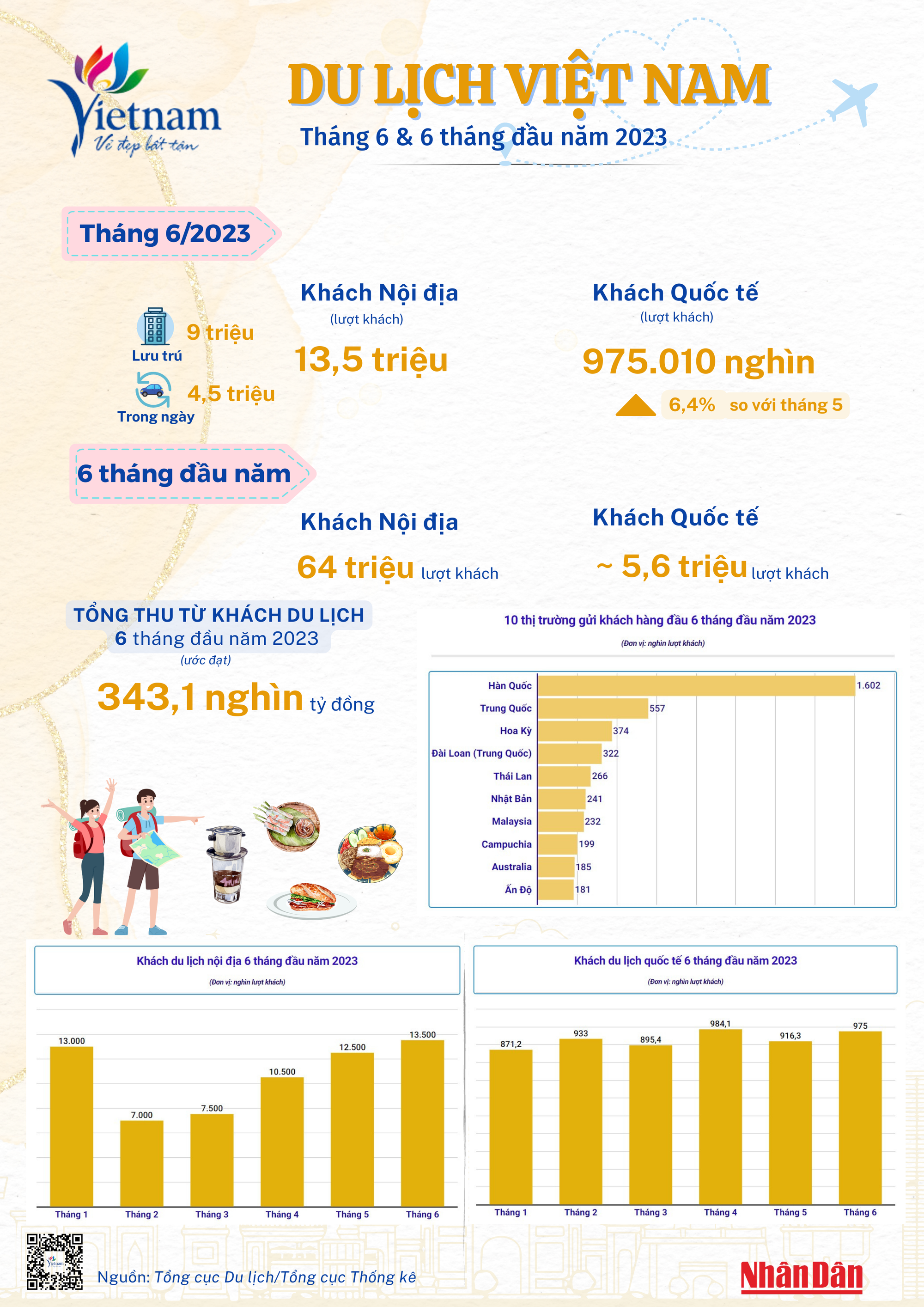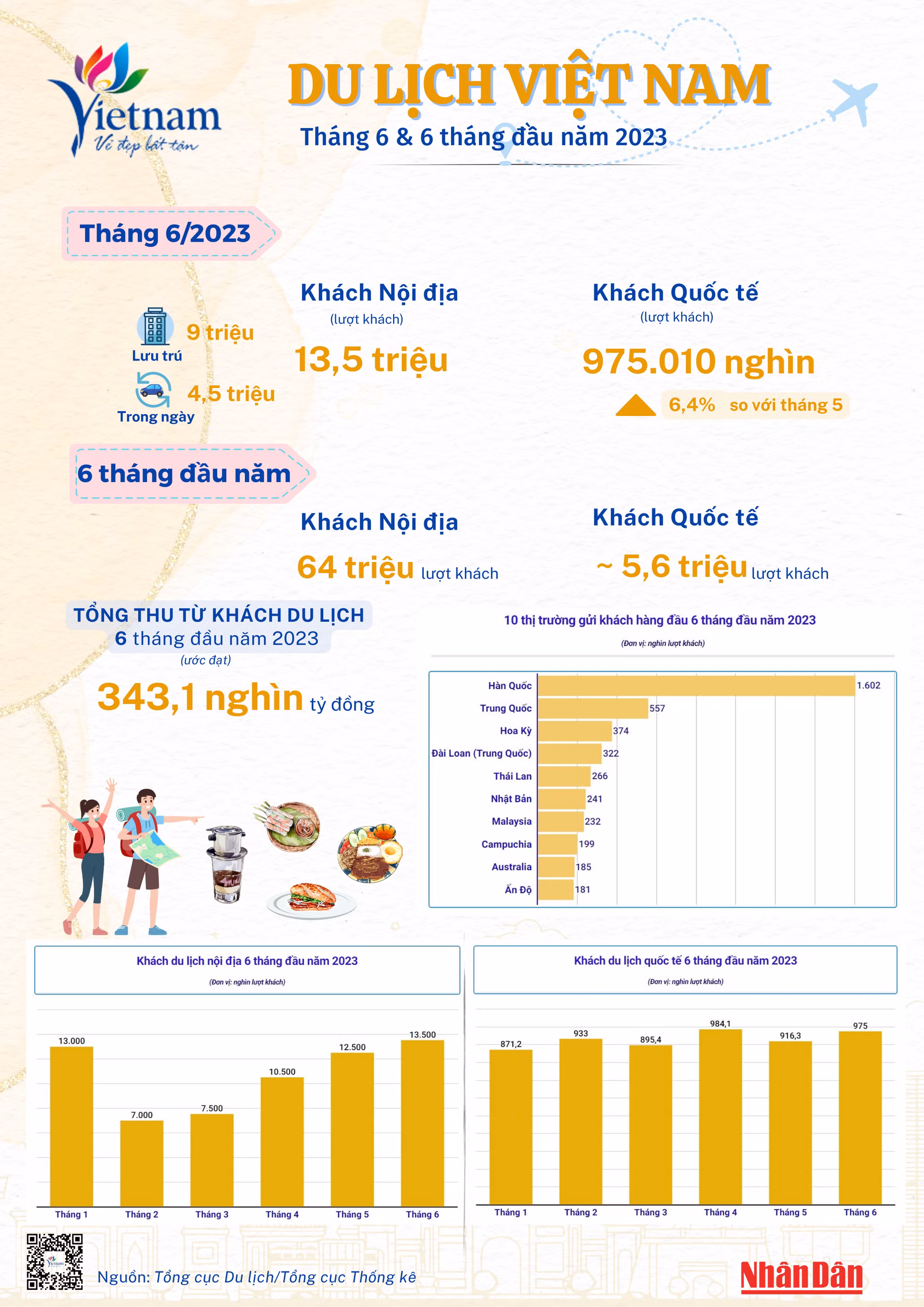 Tiếp nối đà phục hồi của năm 2022, nửa đầu năm 2023, ngành du lịch Việt Nam ghi nhận những tín hiệu đầy lạc quan khi đón gần 5,6 triệu lượt khách quốc tế, đạt 70% kế hoạch cả năm, nhiều thị trường đã phục hồi vượt mức năm 2019. Khách du lịch nội địa đạt 64 triệu lượt. Tổng thu từ khách du lịch đạt 343 nghìn tỷ đồng.
