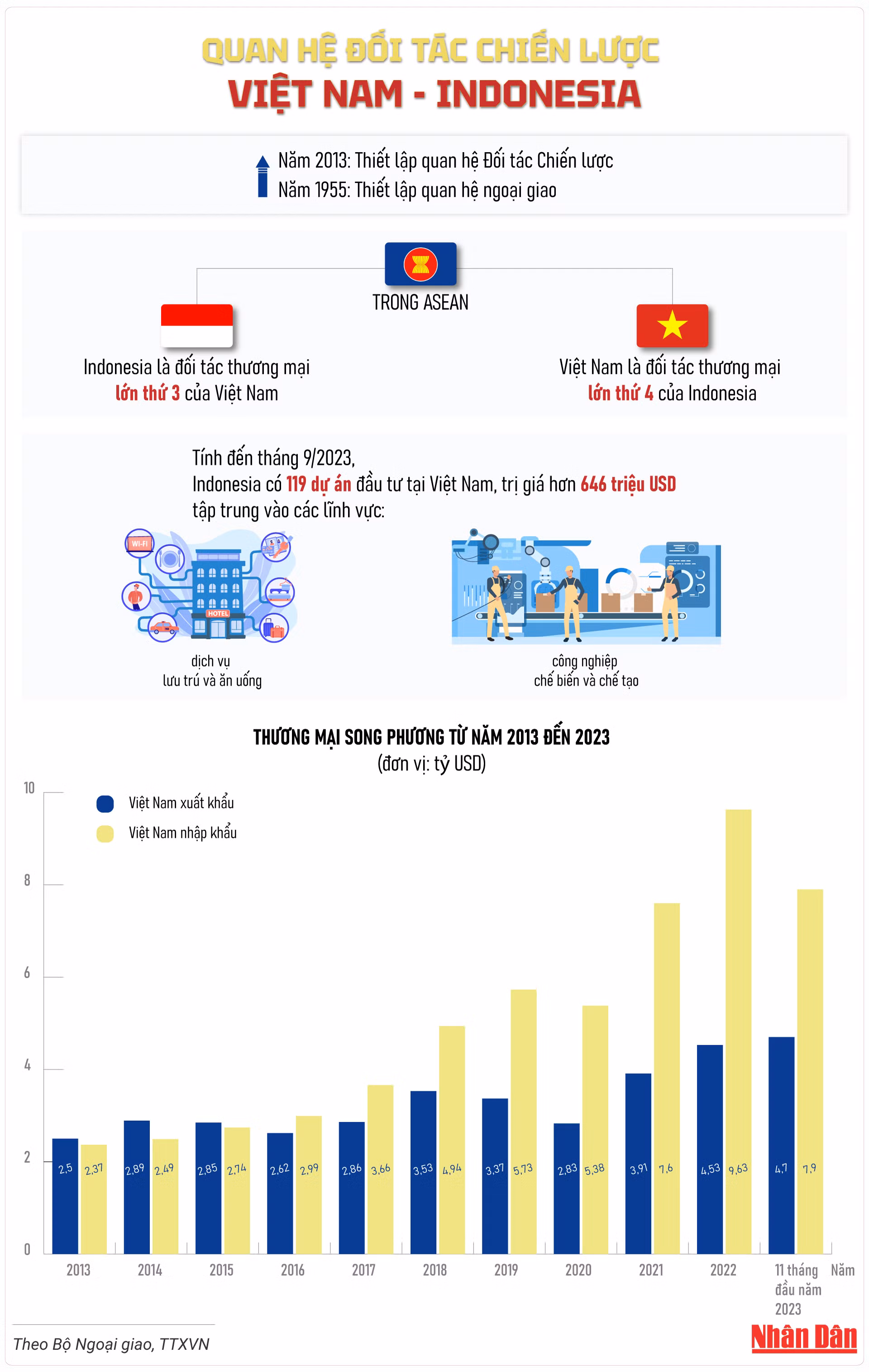 Kể từ khi thiết lập quan hệ ngoại giao đến nay, quan hệ Việt Nam-Indonesia vẫn luôn phát triển mạnh mẽ trên mọi lĩnh vực. Indonesia hiện là một trong những đối tác quan trọng hàng đầu của Việt Nam tại khu vực.