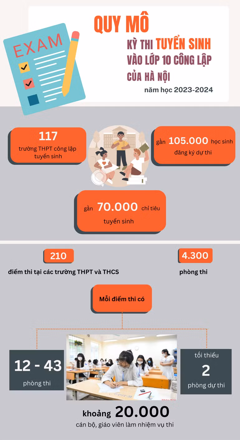 Kỳ thi tuyển sinh vào lớp 10 trung học phổ thông công lập của thành phố Hà Nội năm học 2023-2024 diễn ra trong các ngày từ 9 đến 12/6. Đây là kỳ thi có quy mô lớn của thành phố với gần 105.000 thí sinh tham dự, huy động khoảng 20.000 cán bộ, giáo viên làm nhiệm vụ thi.