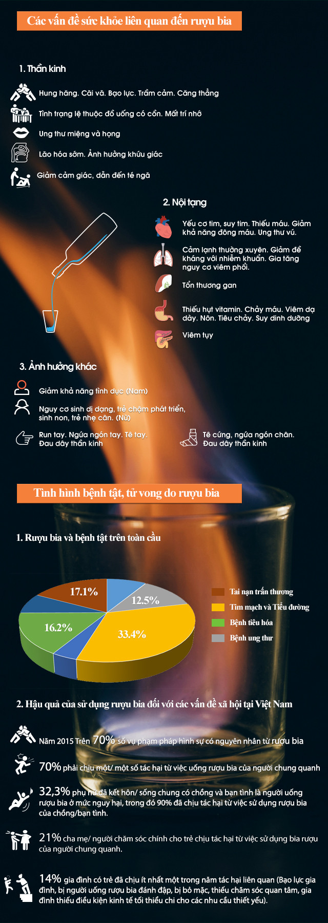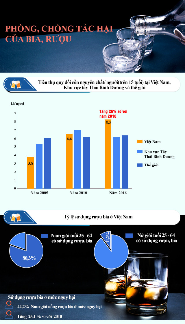 NDĐT - Theo Tổ chức Y tế thế giới (WHO), tiêu thụ rượu bia của người dân Việt Nam ở mức rất cao so với các nước trong khu vực, đứng thứ hai Đông - Nam Á. Rượu, bia là nguyên nhân gây ra 30 mã bệnh tật, nguyên nhân cấu thành của 200 mã bệnh (sử dụng rượu bia kết hợp với một số nguyên nhân khác) thuộc ICD10.