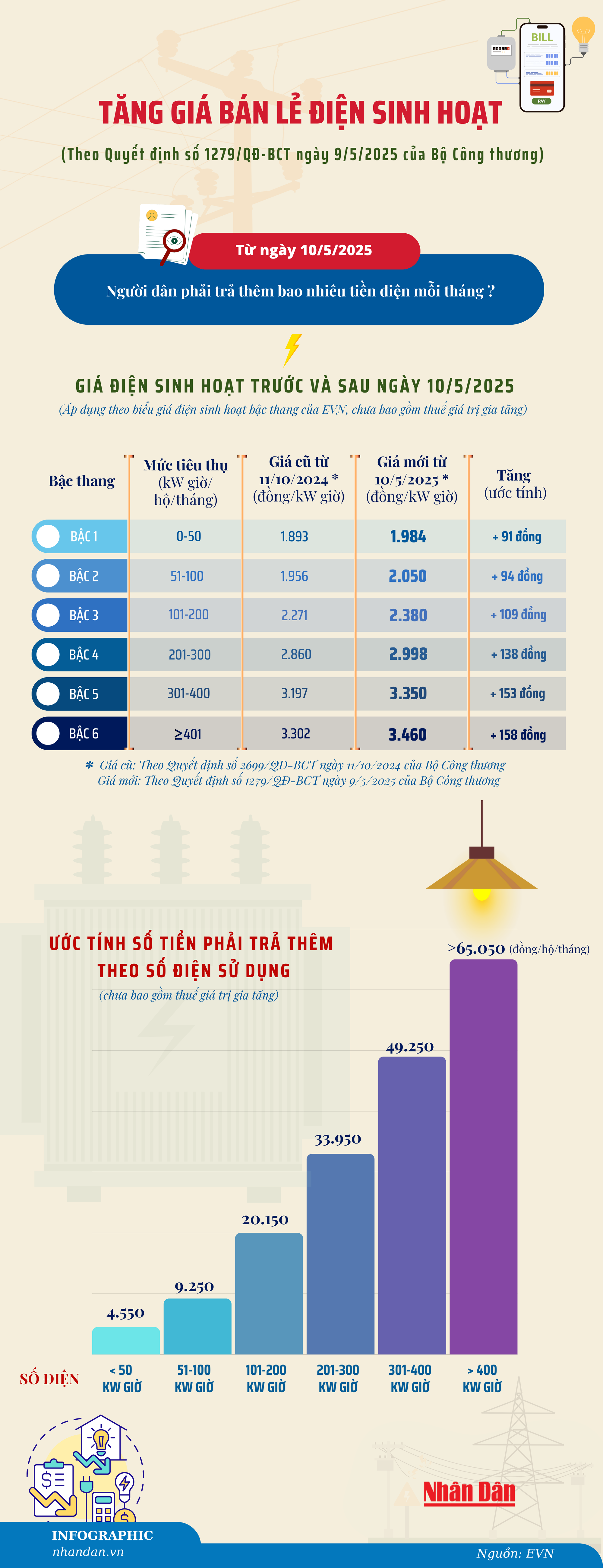 [Infographic] Tăng giá điện từ 10/5, người dân phải trả thêm bao nhiêu tiền điện mỗi tháng?