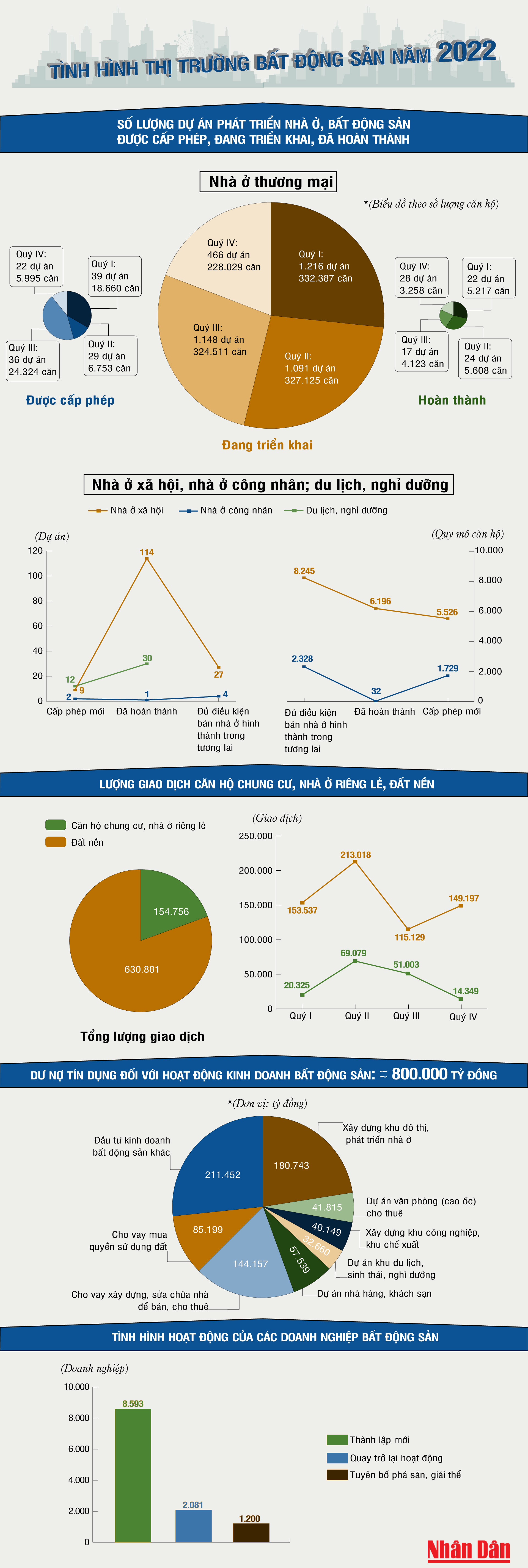 Bộ Xây dựng mới công bố báo cáo về nhà ở và thị trường bất động sản trong quý IV/2022 và cả năm 2022. Trong năm 2022, các dự án bất động sản mới được cấp phép tiếp tục giảm so với năm 2021 khiến nguồn cung bất động sản, nhà ở đặc biệt là nhà ở dành cho đối tượng thu nhập thấp vẫn còn hạn chế. Số lượng doanh nghiệp bất động sản thành lập mới tăng khoảng 13,7%; số doanh nghiệp quay trở lại hoạt động tăng khoảng 56,7%; trong khi số doanh tuyên bố phá sản, giải thể cũng tăng khoảng 38,7% so cùng kỳ năm trước.
