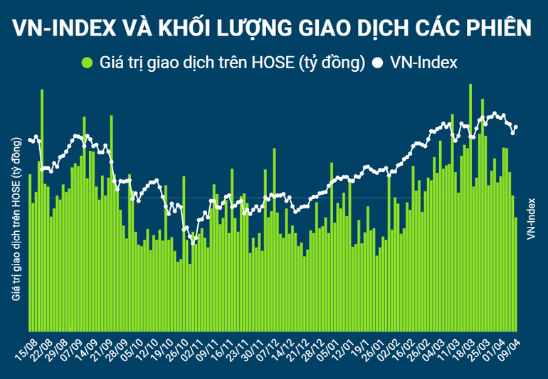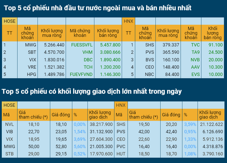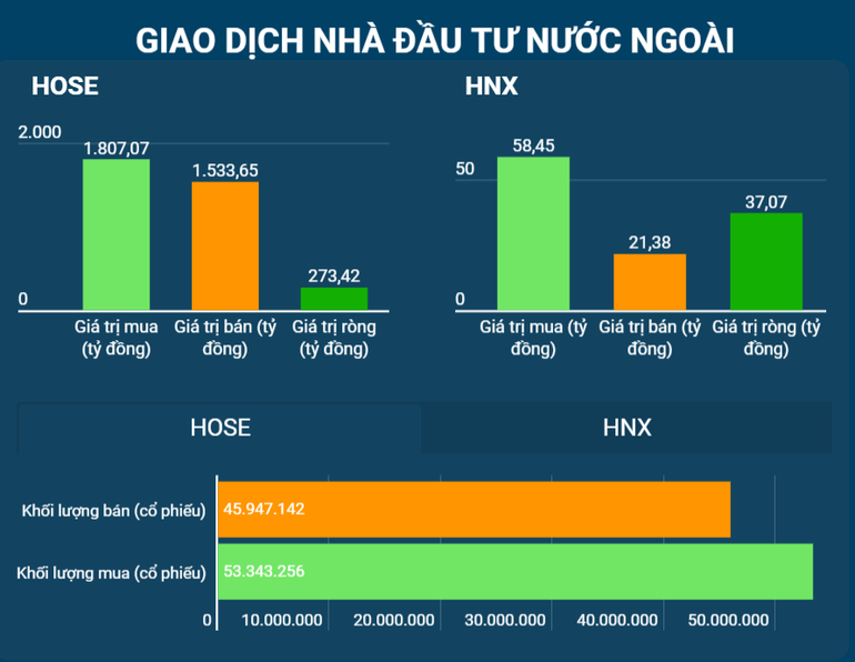 Giá trị khớp lệnh trên hai sàn niêm yết đạt 18.746,16 tỷ đồng được giao dịch, giảm 17,15% so với phiên 8/4, dưới mức trung bình. Khối ngoại mua ròng trong phiên hôm qua trên HoSE với giá trị 273,42 tỷ đồng; mua ròng trên HNX với giá trị 37,07 tỷ đồng.