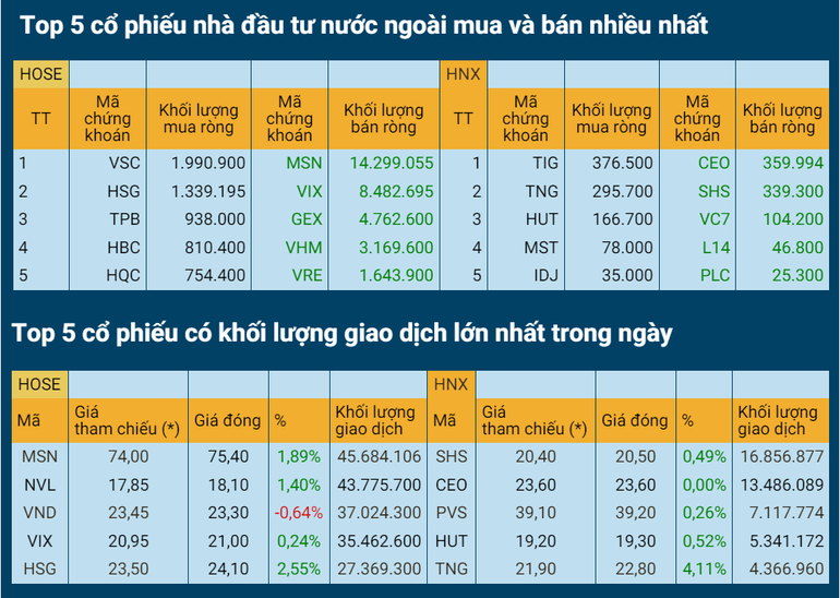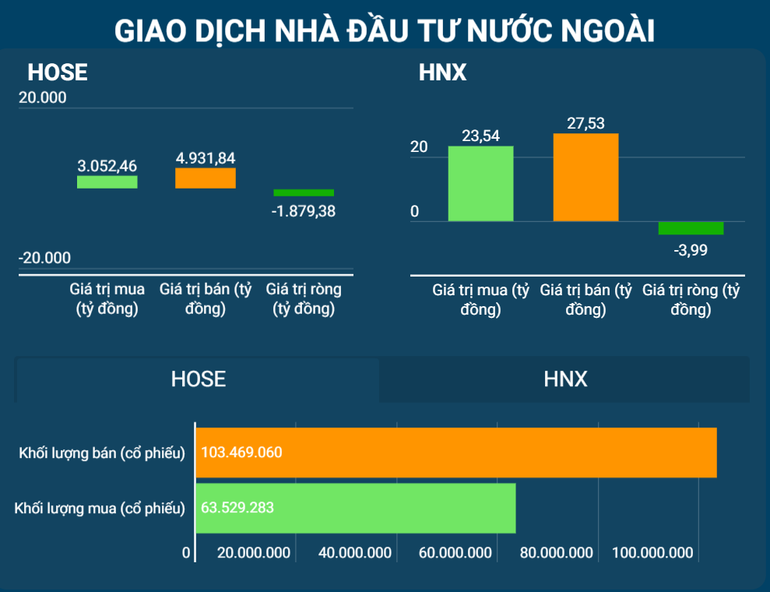 Nhà đầu tư nước ngoài gia tăng mạnh giao dịch trong phiên hôm qua, tiếp tục bán ròng mạnh trên HoSE với giá trị 1.879,38 tỷ đồng, bán ròng trên HNX với giá trị 3,99 tỷ đồng.