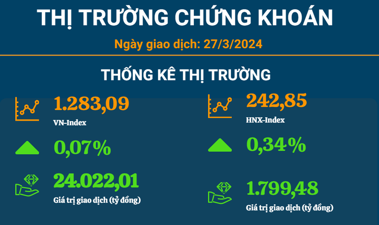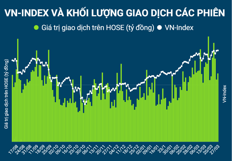 Giá trị khớp lệnh trên hai sàn ngày 27/3 đạt 25.811,65 tỷ đồng, tăng 9,36% so với phiên trước. Trong khi đó, khối lượng giao dịch của VN-Index vẫn giảm 6,43% so với phiên trước, dưới ảnh hưởng của việc thành viên VNDirect không kết nối. Trong thông tin mới nhất chiều 27/3, công ty Chứng khoán VNDirect cho biết đã khôi phục được hệ thống và đang rà soát, đánh giá để bảo đảm an toàn cho khách hàng giao dịch tại công ty.